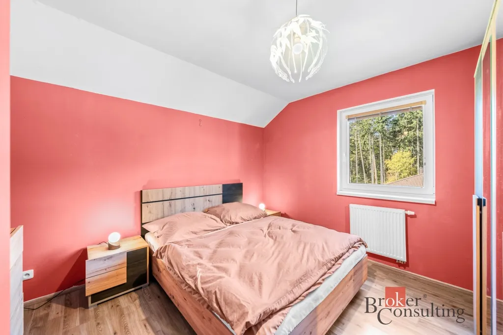 V patře domu jsou umístěny dva dětské pokoje, ložnice a druhá koupelna vybavená vanou, což poskytuje dostatek komfortu pro vícečlennou rodinu.