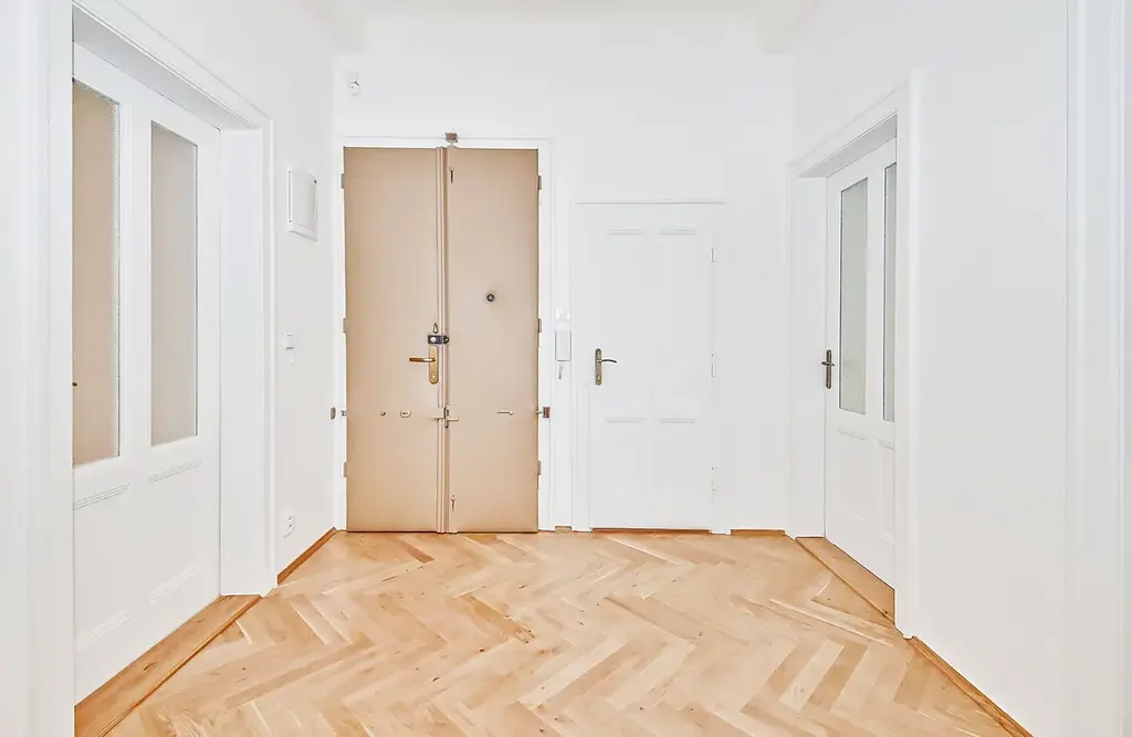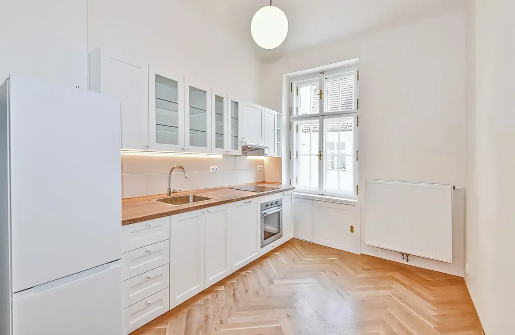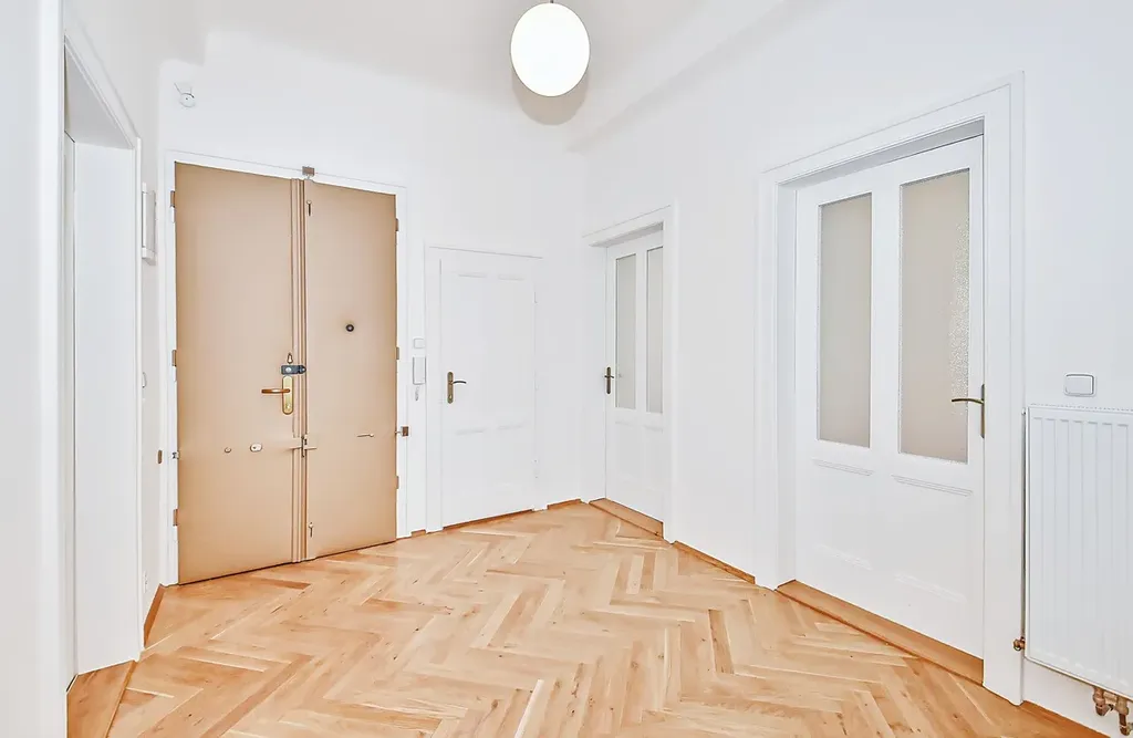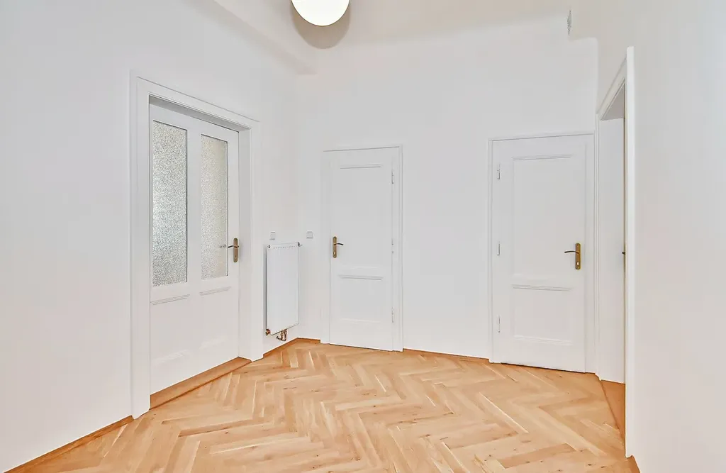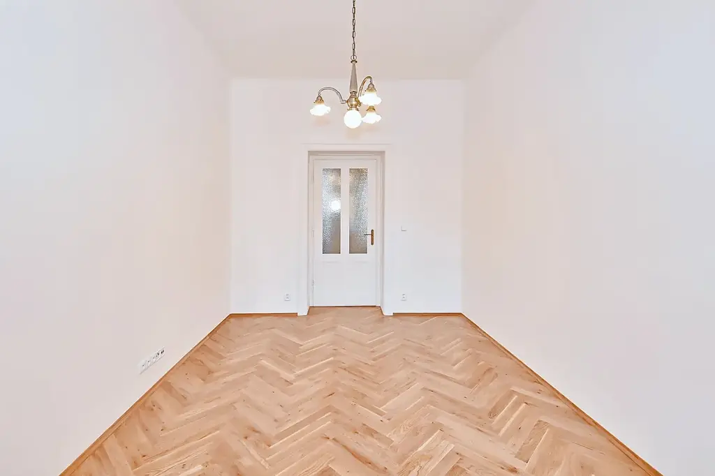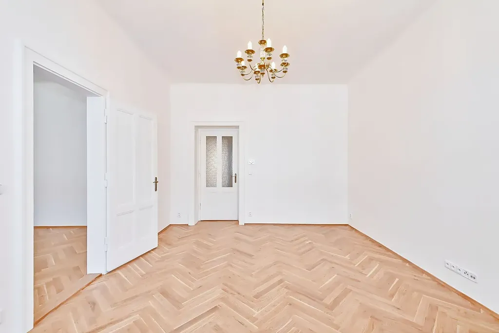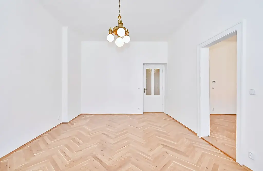 Interiér bytu prošel citlivou rekonstrukcí s důrazem na zachování původních prvků. Byt je nabízen nezařízený a dispozičně nabízí vstupní halu, 3 světlé a prostorné pokoje a samostatnou kuchyň s novou kuchyňskou linkou včetně spotřebičů (lednice s mrazákem, varná deska, trouba, myčka). Jedna ložnice a kuchyň jsou orientovány do klidného vnitrobloku, další dva pokoje do ulice. Byt dále nabízí moderní koupelnu s vanou, samostatnou toaletu a komoru. Podlahy tvoří dřevěné parkety a dlažba.