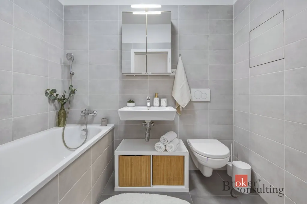 Na první pohled zaujme světlý a vzdušný interiér, který je laděný do jemných, nadčasových tónů. Obývací část s kuchyňským koutem tvoří příjemné centrum celého bytu, kuchyňská linka je kompletně vybavena vestavěnými spotřebiči (myčka, lednice, indukční varná deska a trouba), takže nabízí maximální komfort pro každodenní život i okamžité nastěhování. Díky orientaci oken na východ je byt krásně prosvětlený ranním sluncem a působí velmi příjemnou atmosférou po celý den.