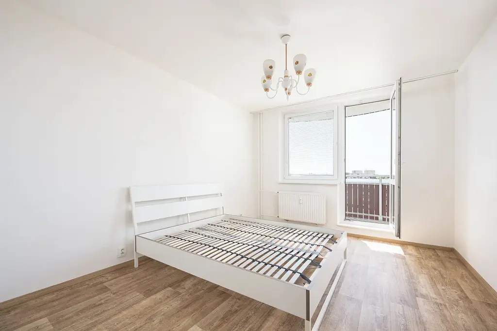 • Ložnice (14,5 m²) – rám manželské postele bez matrací (200 × 160 cm), vstup na balkon