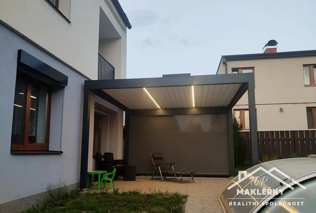 V zadní části u domu je hliníková pergola s otočnými lamelami (jednu stranu lze zastínit stahovací přepážkou) a bazén 3x6m. Střecha rovná, plechová. Do garáže je vstup pouze zvenčí.