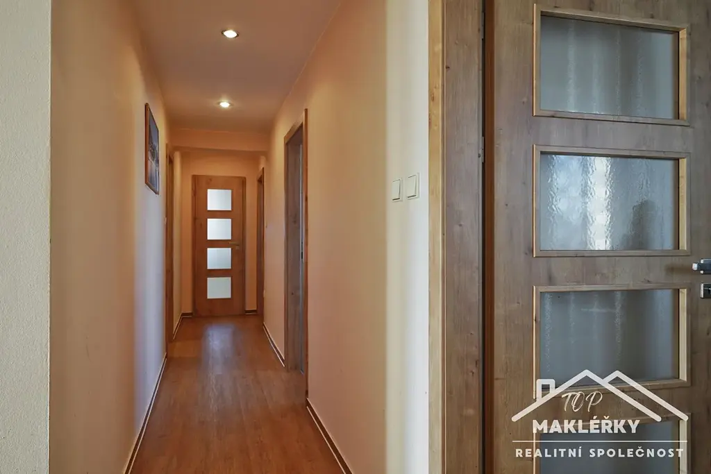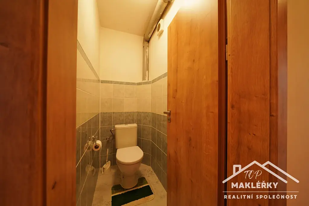 Po schodech do patra vcházíme do chodby a ta se větví do několika místností. Je zde pokoj (možné jako obývací pokoj, kde za závěsem je příprava na další kuchyňské zázemí), další dva dětské pokoje, místnost jako pracovna či cvičebna, vlevo WC a koupelna (vana, sprchový kout, topení, radiátor a umyvadlo). Ve stavbě je použito obloukových vstupů mezi místnostmi.