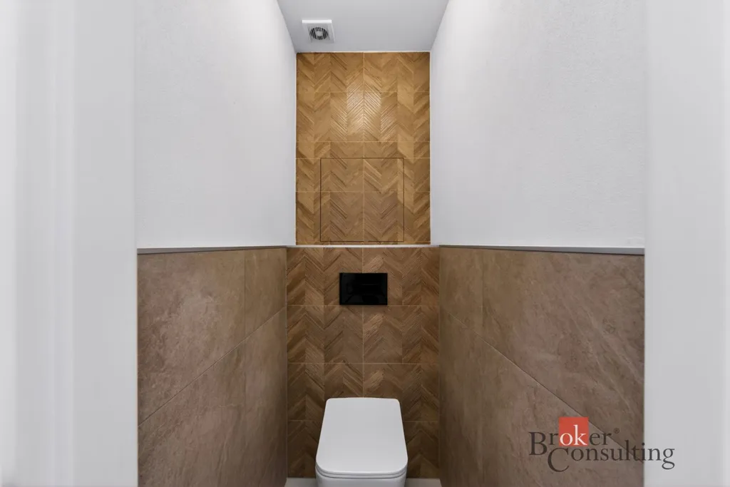 Koupelna je řešena v moderním stylu a disponuje vanou, umyvadlem a nástěnným podsvíceným zrcadlem. Toaleta je zde oddělená a hned vedle ní se nachází praktická technická místnost.