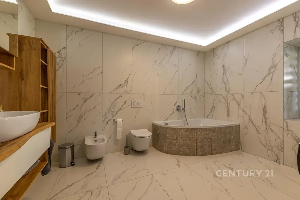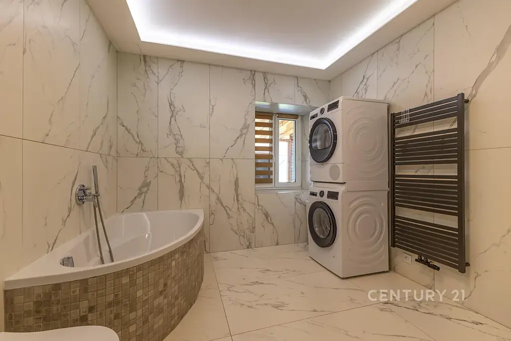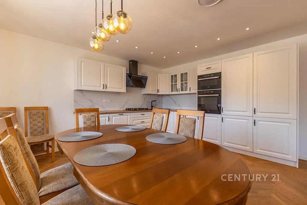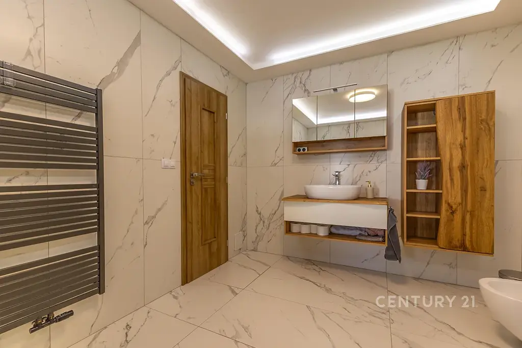 Interiér domu byl navržen s maximálním důrazem na detail a kvalitu použitých materiálů, což pocítíte hned při prvním vstupu. Celým obytným prostorem procházejí luxusní dřevěné parketové podlahy, které harmonicky doplňují vstupní halu a koupelny s velkoformátovou dlažbou a obklady v elegantním mramorovém dekoru. Srdcem přízemí je velkorysý obývací pokoj propojený s jídelní částí a moderní kuchyní. Kuchyňská linka je vybavena špičkovými vestavěnými spotřebiči, plynovým sporákem a designovou digestoří. Atmosféru prostoru dotvářejí stylové betonové stěrky na stěnách a promyšlené podsvícení stropů, které spolu s designovými svítidly vytvářejí jedinečný estetický zážitek.