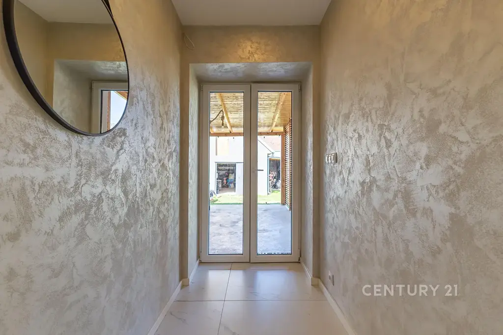 Exteriér domu je stejně propracovaný jako jeho vnitřní část. Na zadní část domu plynule navazuje terasa se stíněním, která byla dokončena v loňském roce a představuje ideální místo pro relaxaci či setkávání s přáteli. Zahrada s čerstvě osetým trávníkem poskytuje dostatek soukromí i prostoru pro další vyžití. V zadní části pozemku se nachází samostatná, velmi prostorná garáž pro jeden automobil s dalším úložným zázemím. Pro majitele více vozů je připraveno pohodlné parkování pro další dvě auta přímo na pozemku vedle domu.