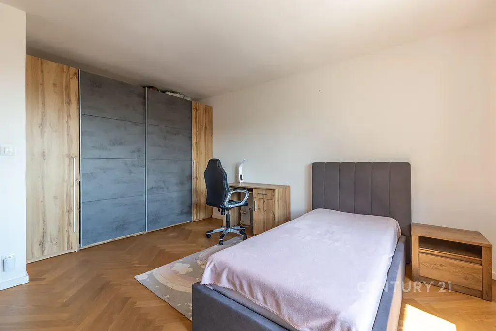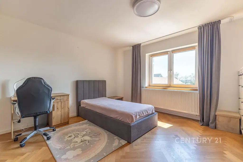 Privátní zóna domu se nachází v horním patře, kde jsou situovány dva světlé dětské pokoje a hlavní ložnice vybavená praktickou skříní. Velkou předností domu je existence dvou koupelen. Zatímco v horním patře naleznete menší koupelnu se sprchovým koutem a toaletou, v přízemí se nachází hlavní rodinná koupelna s prostornou vanou, velkým umyvadlem a dedikovaným místem pro pračku i sušičku. Celý dům je částečně podsklepen, což nabízí další cenné úložné prostory k již tak velkorysé dispozici dvou nadzemních podlaží.