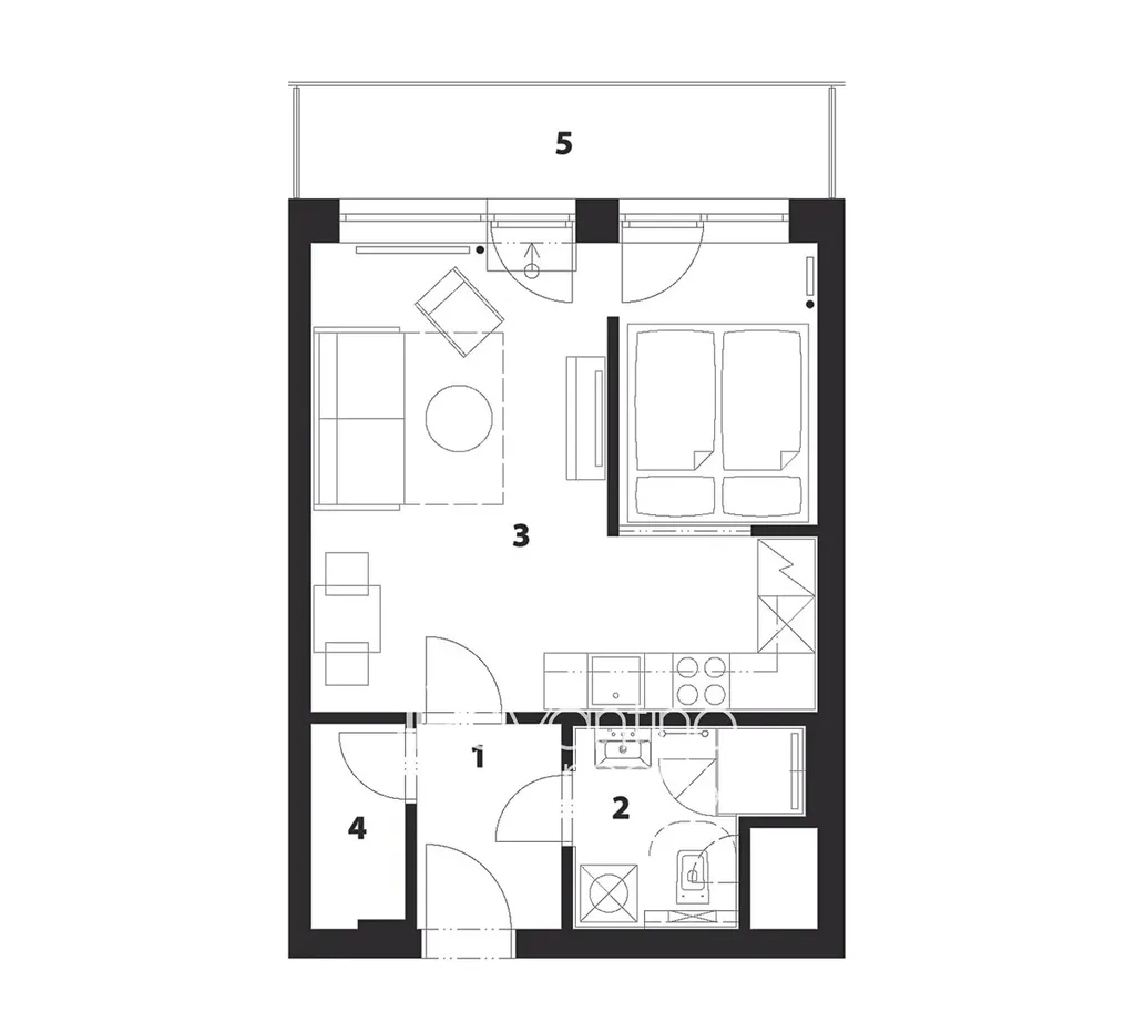 - Byt je rozdělen na tři zóny – kuchyňský kout, obývací pokoj a ložnice