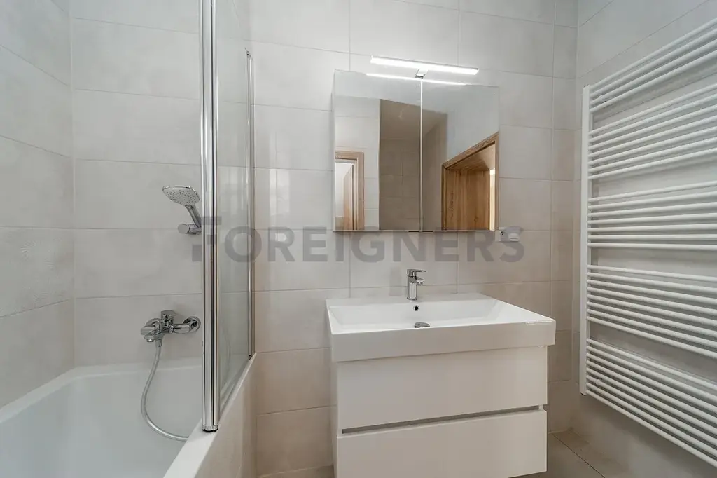Byt se pronajímá s kuchyňskou linkou s indukční deskou, elektrickou troubou, digestoří, myčkou a vestavěnou lednicí s mrazákem.