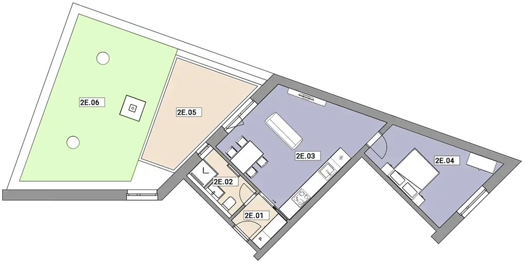 Byt 2E je dispozičně členěn na 2+kk, má užitnou plochu (52 m²) a je orientován na západ, což přináší příjemné odpolední slunce a světlý interiér. Hlavní předností je terasa (16 m²) se soukromou zahradou (38 m²), která výrazně rozšiřuje obytný prostor a vytváří ideální místo pro odpočinek, práci i setkávání s přáteli. K bytu je navíc možno dokoupit parkovací stání za cenu 600.000,- Kč bez DPH, což představuje praktické a komfortní řešení parkování v této lokalitě.