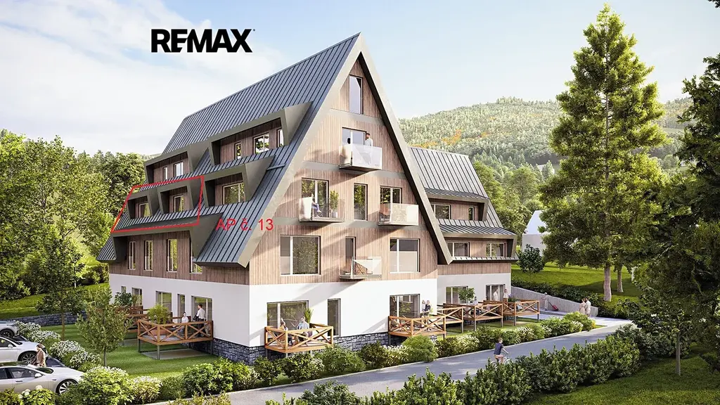 K jednotce náleží balkon o velikosti 2,44 m2, který umožňuje relaxaci s výhledem na okolní přírodu. K jednotce náleží náleží privátní uzamykatelná kolárna + lyžárna, parkovací stání a možnost využívat společného wellness.