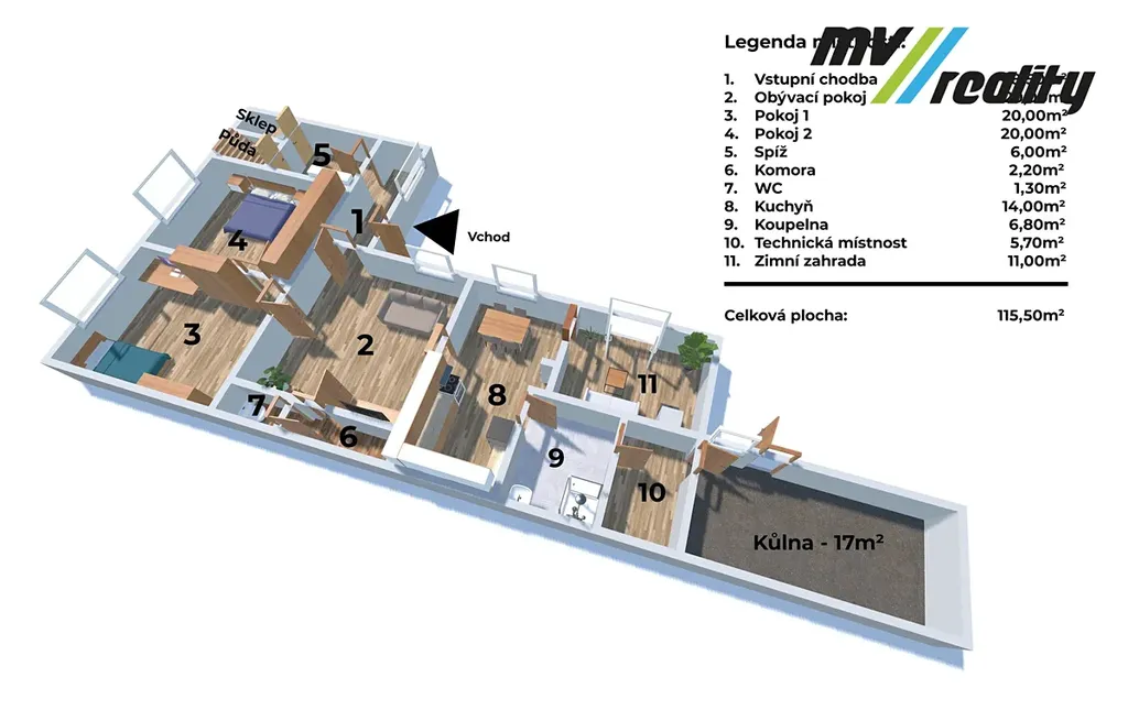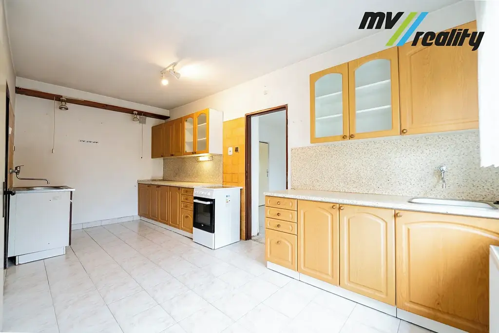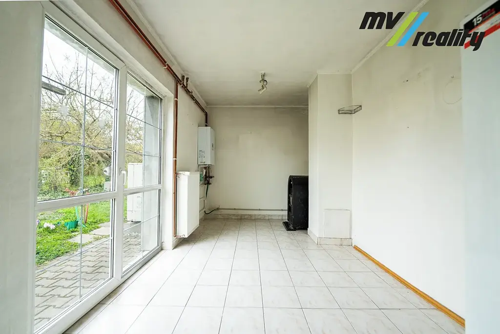 Dispozičně nabízí prostorný obývací pokoj, dva pokoje, kuchyň s jídelním koutem, zimní zahradu koupelnu, samostatné WC, technickou místnost, spíž a komoru, která může sloužit například jako pracovna či šatna. Součástí je také kůlna, kterou lze využít jako dílnu. K dispozici je garáž s navazujícím přístřeškem, sklep a půda, což zajišťuje dostatek úložného prostoru.