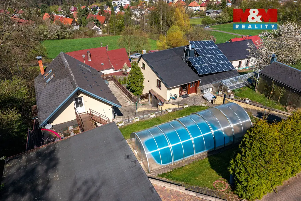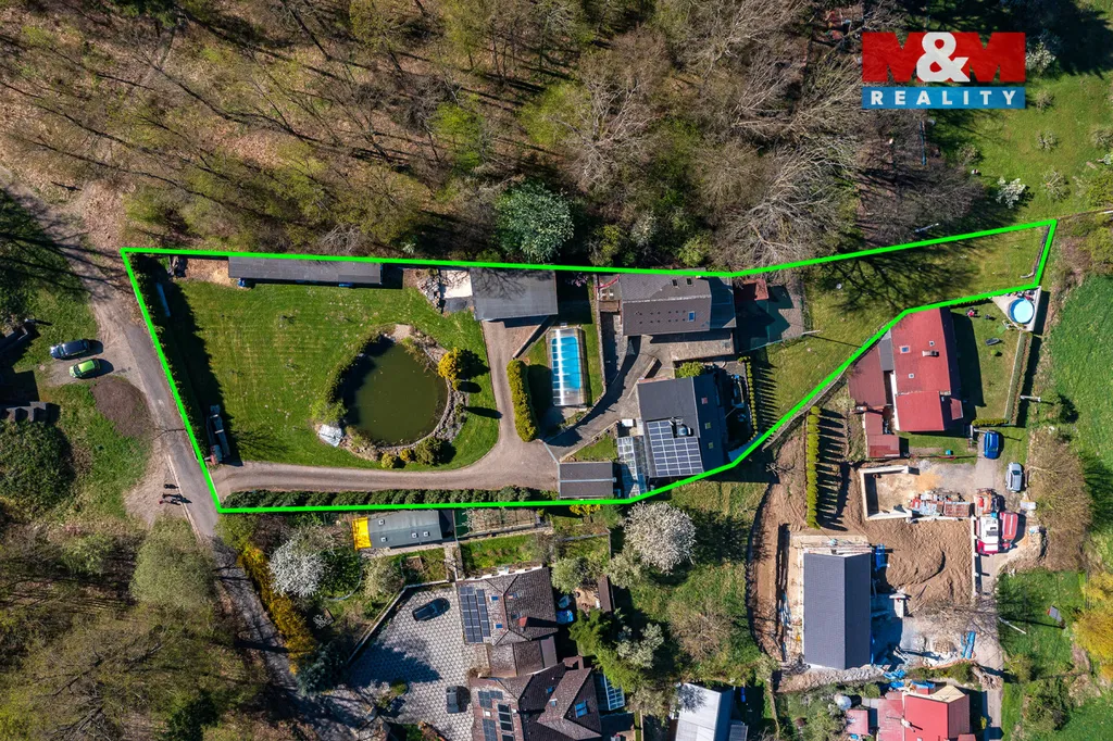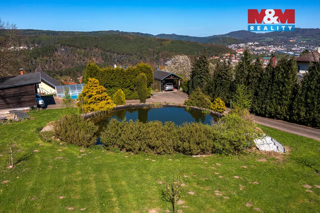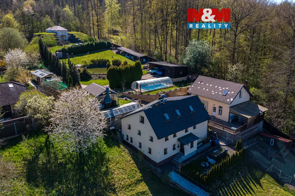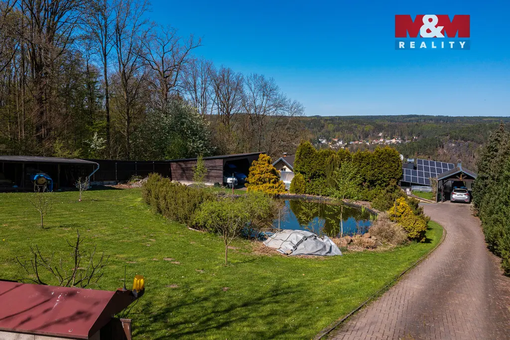 K domu náleží prostorná terasa s úžasným výhledem. Pozemek o celkové výměře 3 033 m² poskytuje dostatek soukromí i široké možnosti využití. Najdete zde zastřešený bazén, okrasný rybníček, nově vysazené ovocné stromy a zděnou dvojgaráž s dílnou. Podkroví garáže je připraveno pro vybudování samostatné bytové jednotky o dispozici 2+1.