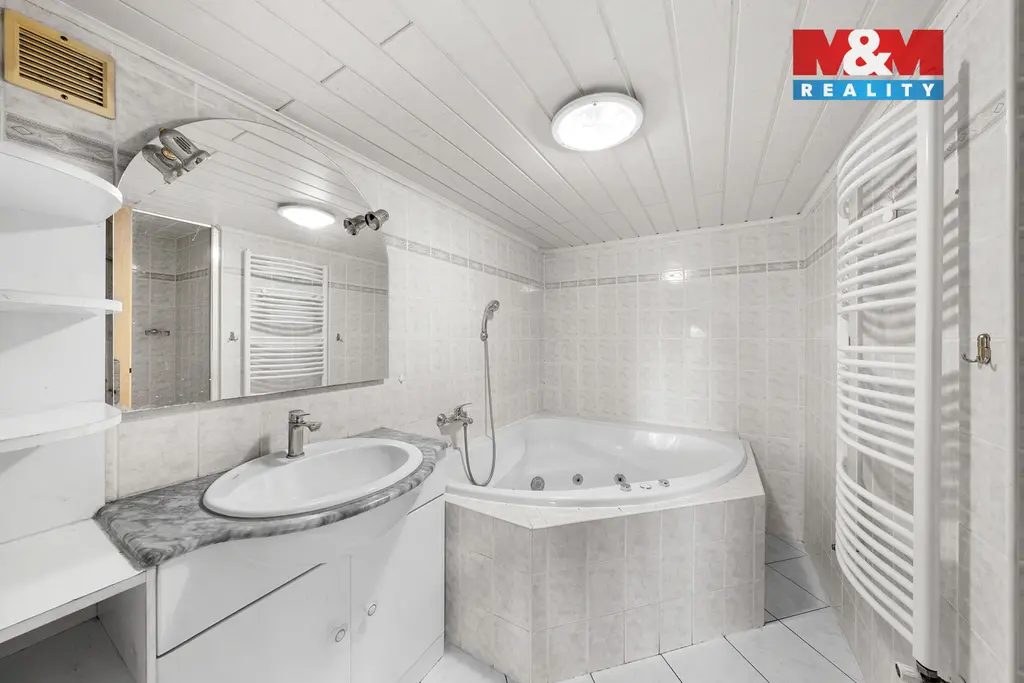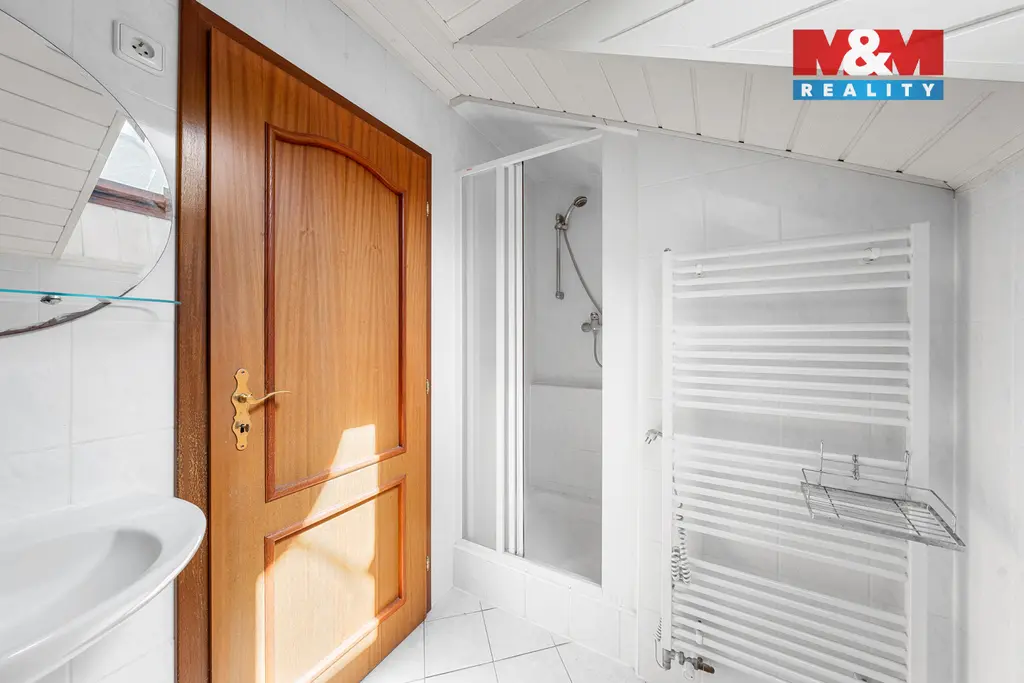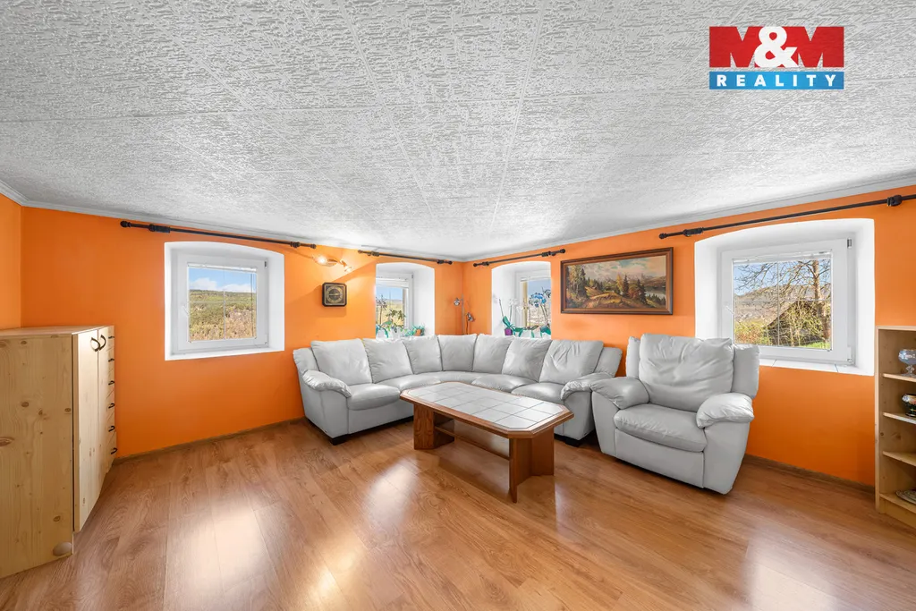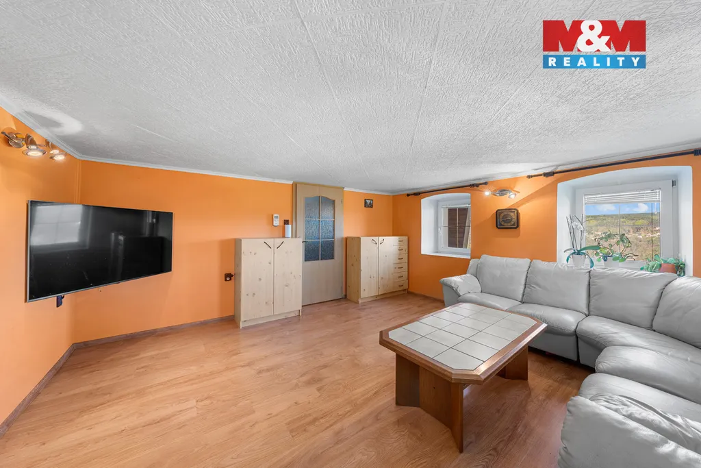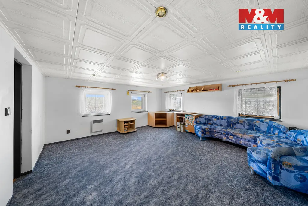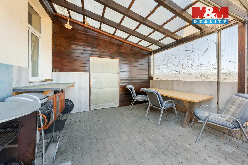 K domu náleží prostorná terasa s úžasným výhledem. Pozemek o celkové výměře 3 033 m² poskytuje dostatek soukromí i široké možnosti využití. Najdete zde zastřešený bazén, okrasný rybníček, nově vysazené ovocné stromy a zděnou dvojgaráž s dílnou. Podkroví garáže je připraveno pro vybudování samostatné bytové jednotky o dispozici 2+1.