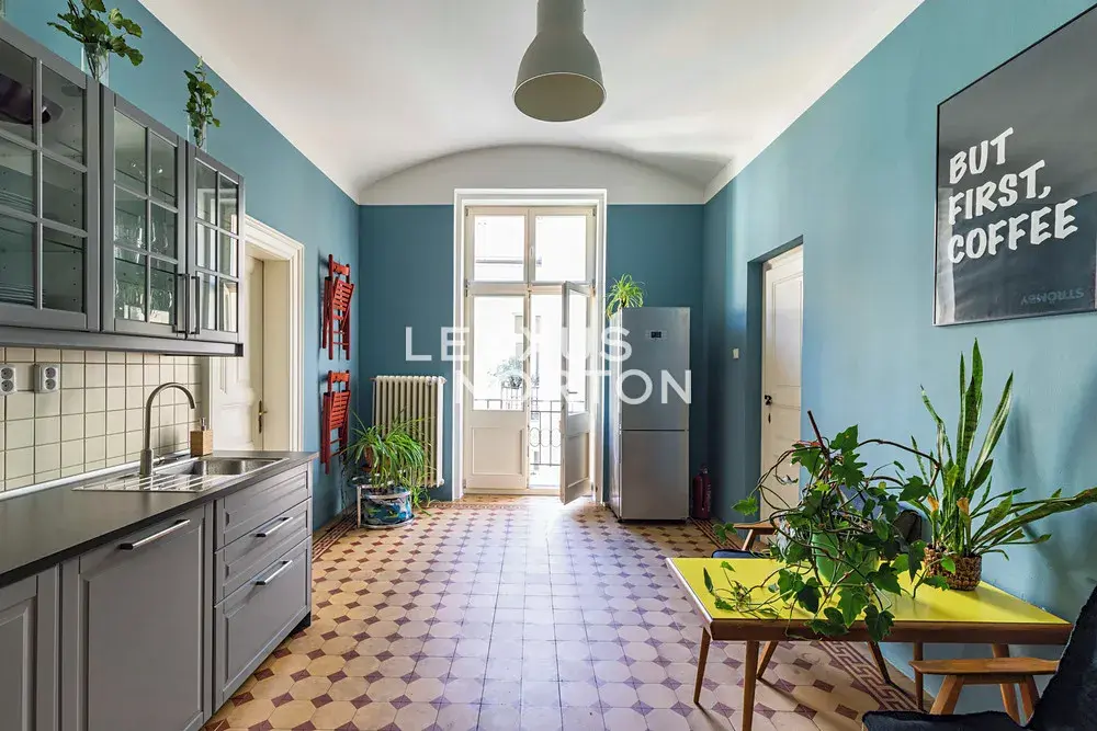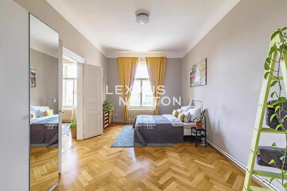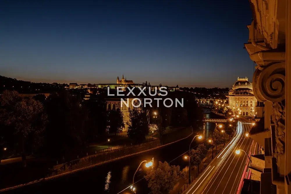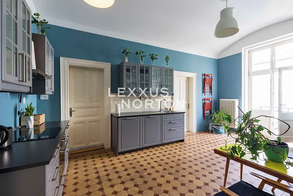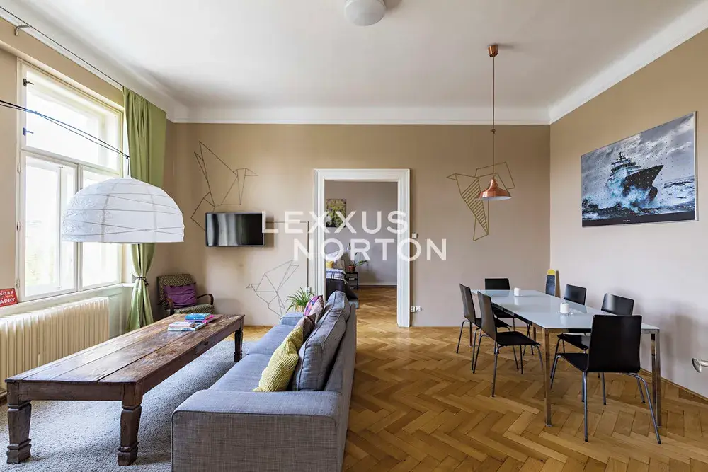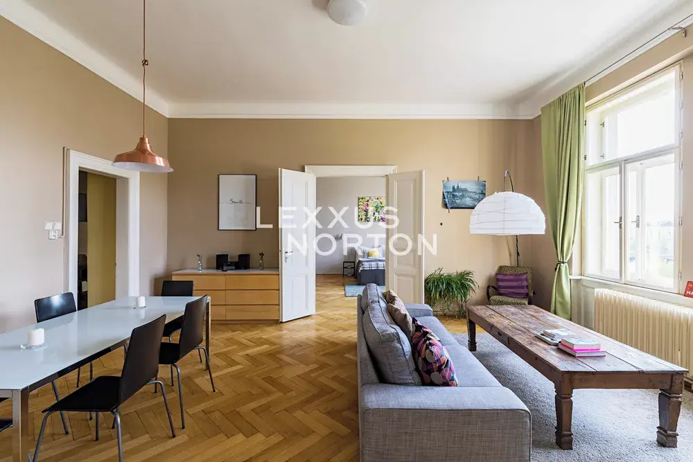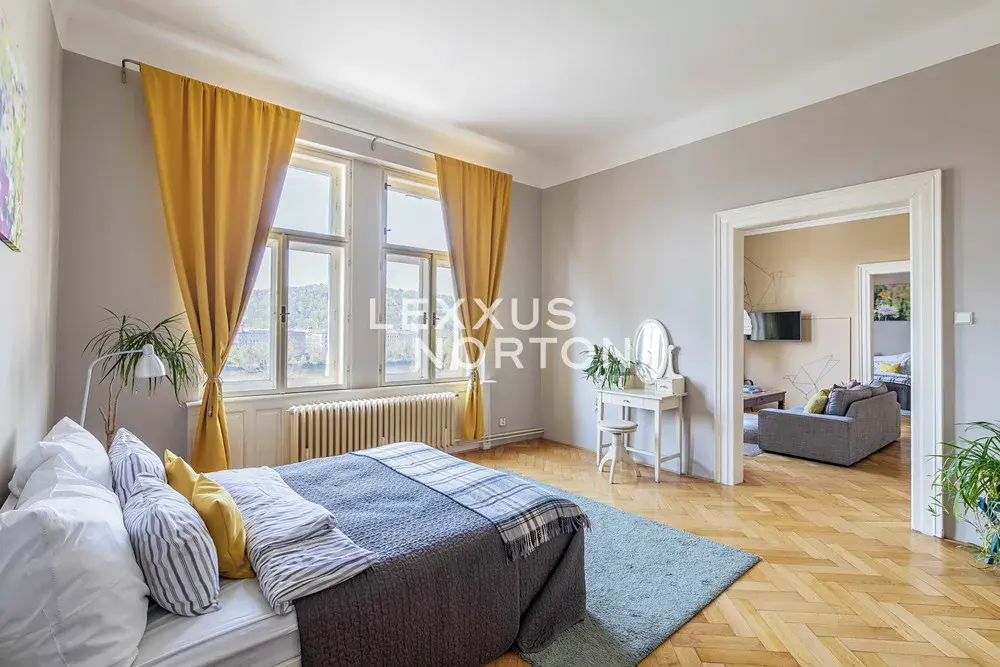 Slunný byt v posledním klasickém patře činžovního domu s panoramatickými výhledy na Pražský hrad, Vltavu a Petřín. Prostorný interiér zahrnující tři místnosti obrácené na západ k řece, velkou samostatnou kuchyň a menší pokoj orientované do vnitrobloku a příslušenství, osvětlují vysoká špaletová okna se skvělými výhledy. Vysoké stropy a parketové podlahy dokreslují charakter bytu a předurčují jej jako nejlepší volbu pro pražské bydlení nebo jako dlouhodobou investici v centru města. Společné prostory jsou udržované, v dobrém stavu a dům je vybaven výtahem. Možnost pronájmu parkovacího stání v Národním divadle.