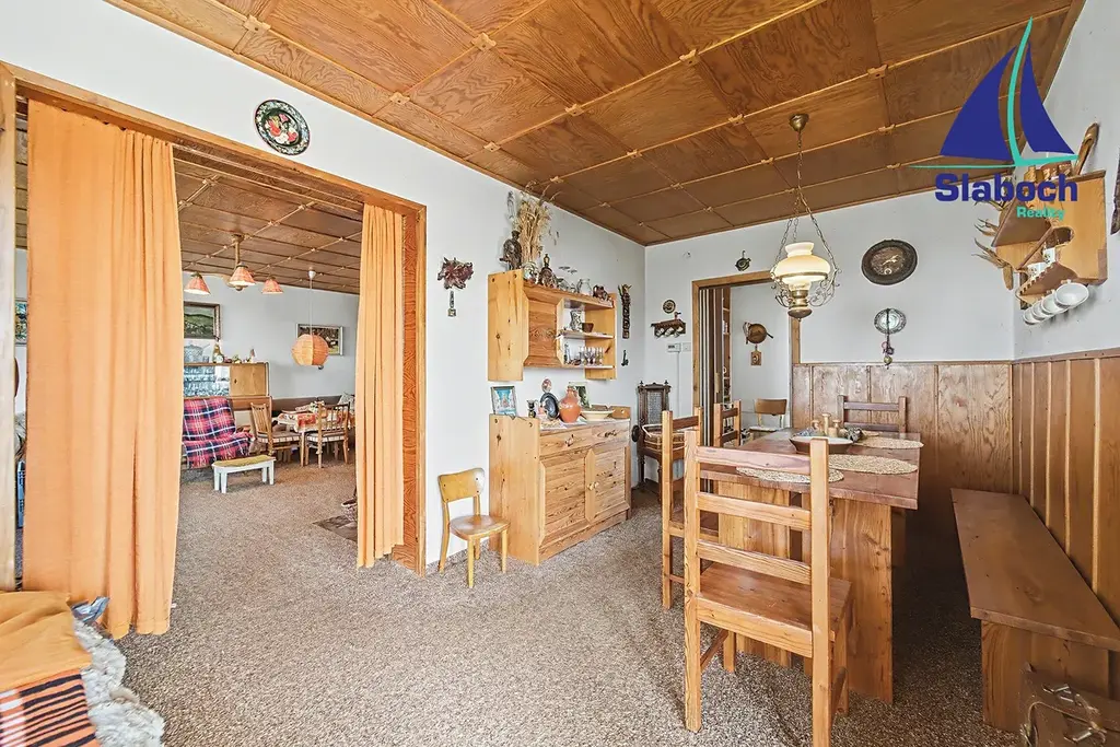 Patrový rodinný dům na malebném a klidném místě v horní části města, 400m od hradu je spíše v udržovaném původním stavu, dům má 3NP v přízemí domu 1NP které je přístupné přes garáž je samostatná garáž, technická místnost (dílna), pokoj, koupelna, špajz, ve 2NP je kuchyně, špajz, jídelna, obývací pokoj s krbem, toaleta a terasa s krbem s možností posezení a výhledem na okolí, ve 3NP 3 pokoje, koupelna , toaleta a balkon na který je vstup z prostředního pokoje, v domě krásné dřevěné schodiště, vstup do 2NP je hlavním vchodem ze zadní části domu.