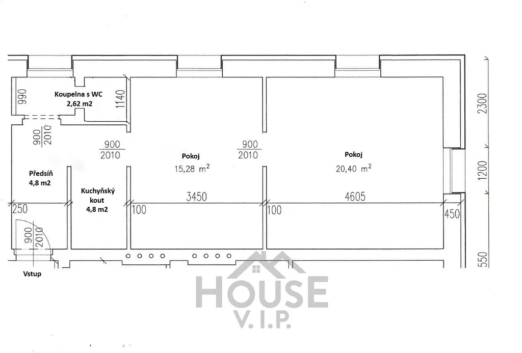 Předsíň, kuchyňský kout, koupelna s WC a dále dvě obytné místnosti.
