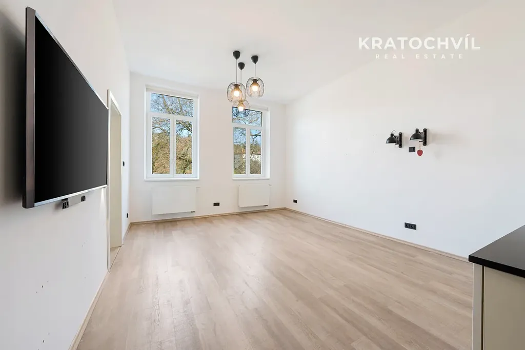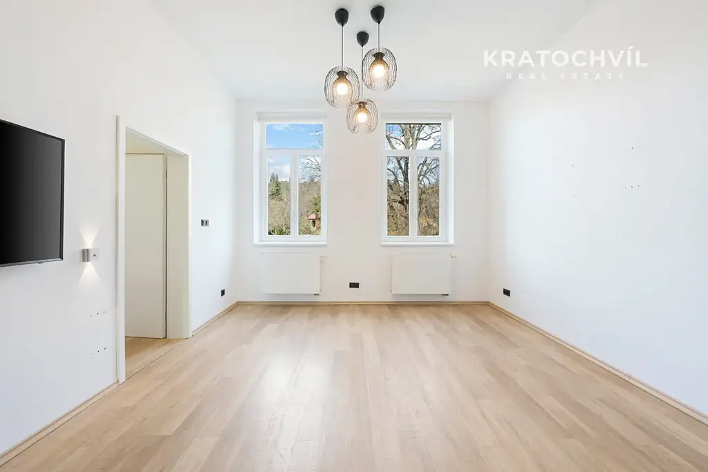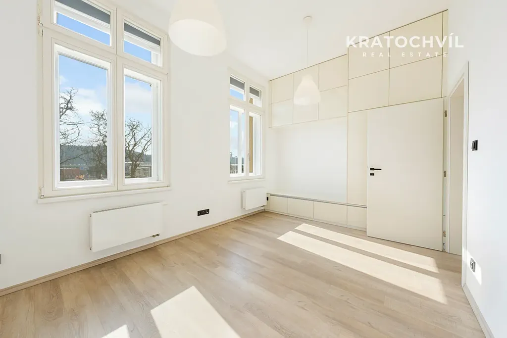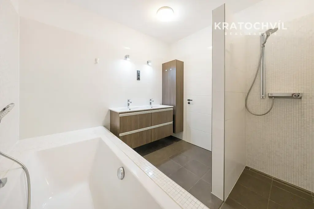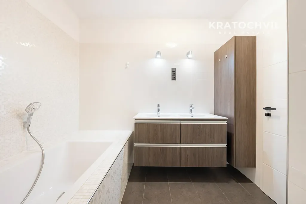 Velkou výhodou bytu je prostorná koupelna, která nabízí jak sprchový kout, tak vanu, dvě umyvadla a dostatek místa pro komfortní každodenní využití.