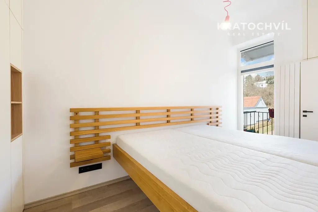 Ložnice o velikosti 12 m² nabízí klidné zázemí a zároveň přímý vstup na menší balkon s výhledem do zeleně, což vytváří velmi příjemnou atmosféru pro ranní kávu nebo večerní odpočinek.