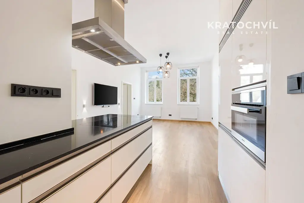 Dominantou bytu je velkorysý obývací pokoj s kuchyňským koutem o velikosti 28 m², který tvoří příjemný otevřený prostor pro každodenní život i setkávání s přáteli. Moderní kuchyňská linka je vybavena vestavěnými spotřebiči a doplněna elegantní pracovní deskou.