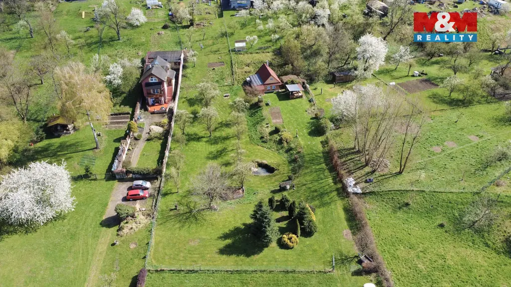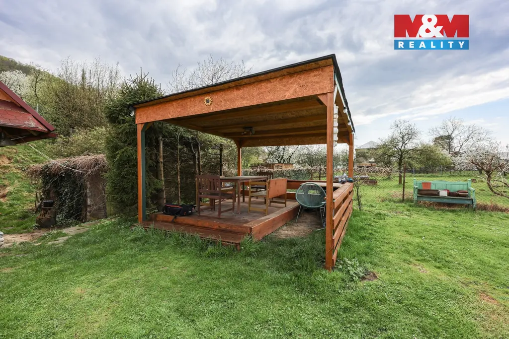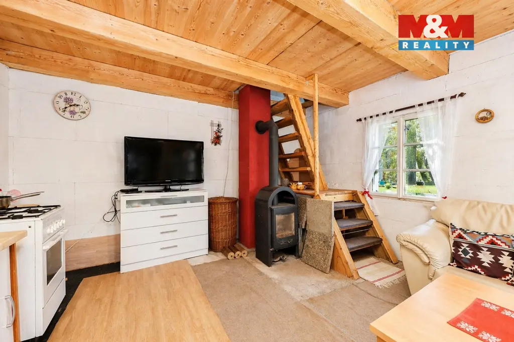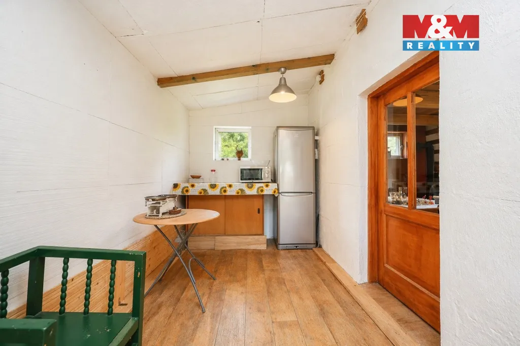 Na pozemku se nachází dřevěná chata se zastavěnou plochou 48 m², která poskytuje okamžité zázemí pro rekreaci i případnou realizaci budoucí výstavby. Dispozice chaty je řešena prakticky – v přízemí se nachází kuchyně a velká obývací místnost, v podkroví pak prostorný pokoj vhodný pro spaní či odpočinek. Chata disponuje vlastní studnou, suchým záchodem a zahradní sprchou, což umožňuje plnohodnotné využití v průběhu letní sezóny.