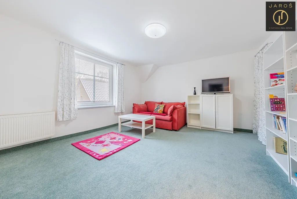 V patře domu pak najdeme dva pokoje / ložnice, 18 a 13 m2. Větší pokoj je doplněn šatnou 1,6m2. V patře domu se nachází také malá pracovna 3m2 a dále zatím nevyužitý půdní prostor.