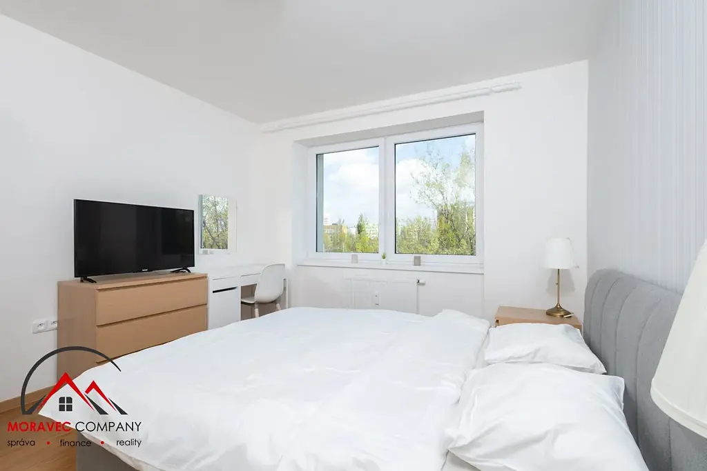 Byt je plně vybaven – nechybí nábytek, spotřebiče i nádobí. Stačí si jen přinést osobní věci a můžete bydlet!
