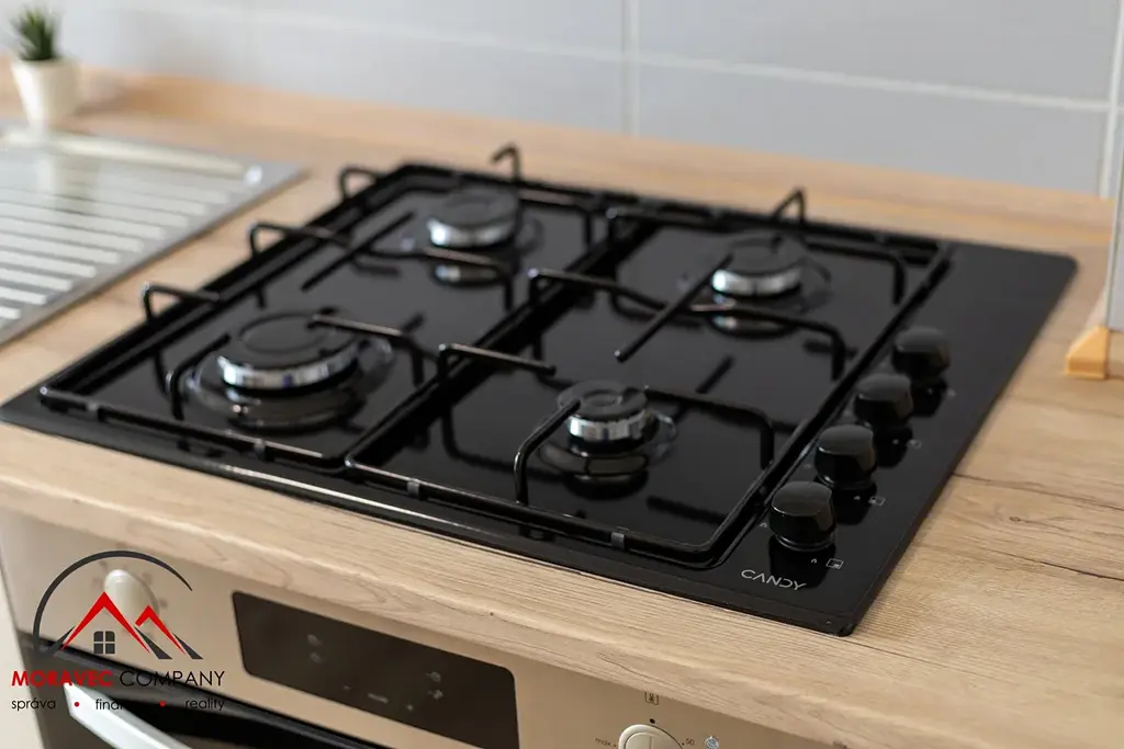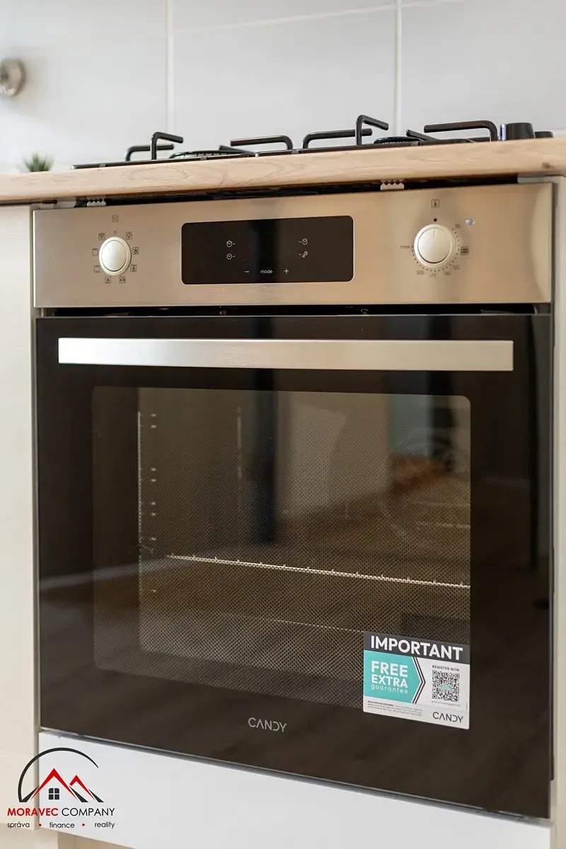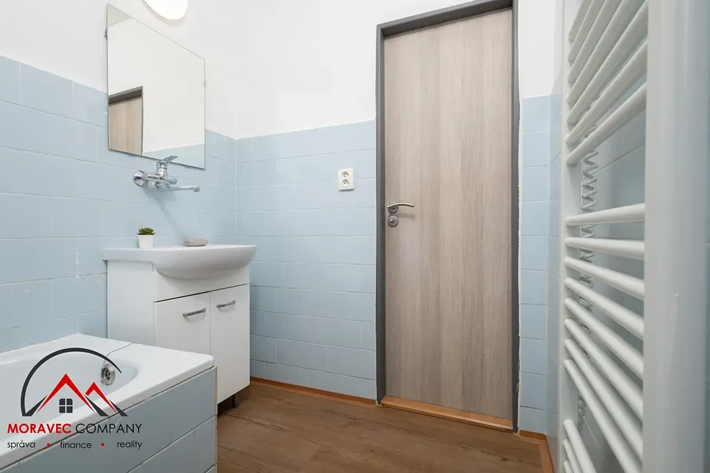 V bytě je kuchyně s kombinovaným sporákem, dále samostatný pokoj a koupelna s vanou, praktickými úložnými skříňkami a WC. Vytápění zajišťují plynové gamaty, ohřev vody je řešen elektrickým bojlerem.