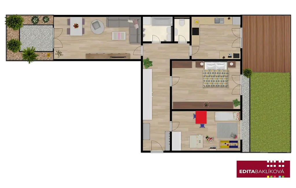 Byt je ideální pro rodinné bydlení i pro zájemce hledající klid a soukromí s vlastním kouskem přírody přístupným přímo z bytu.