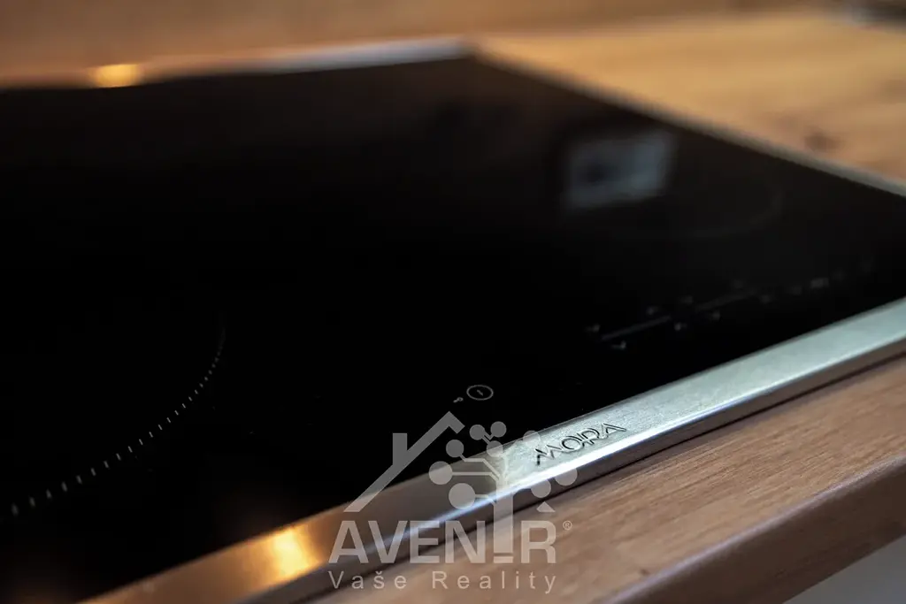 V kuchyni je kompletní sada spotřebičů značky Mora: vestavěná lednice s mrazákem, vestavěná elektrická trouba, elektrická varná deska, digestoř a myčka nádobí.