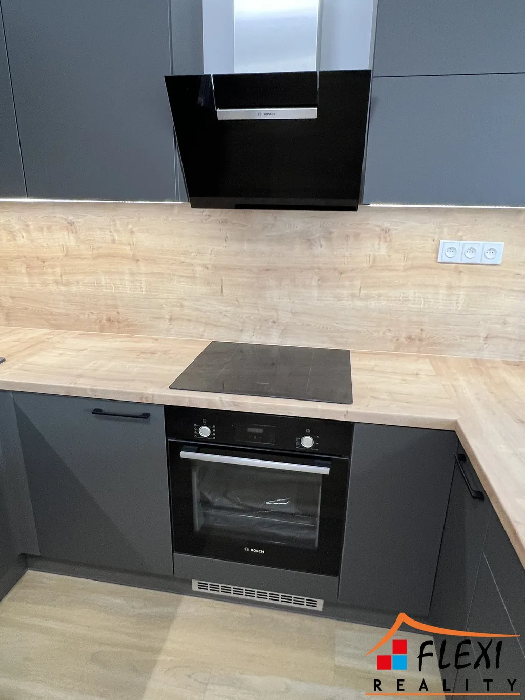 Kuchyň na míru je vybavena spotřebiči Bosch (myčka, lednice, mikrovlnná trouba, varná deska, digestoř a trouba).