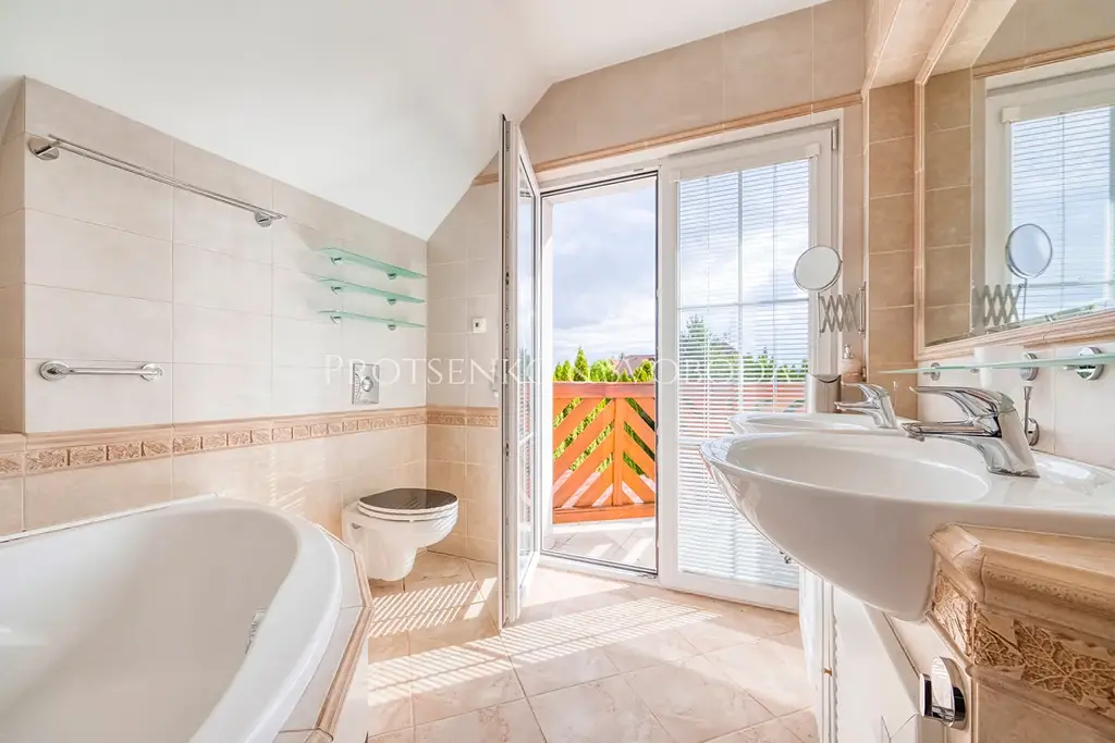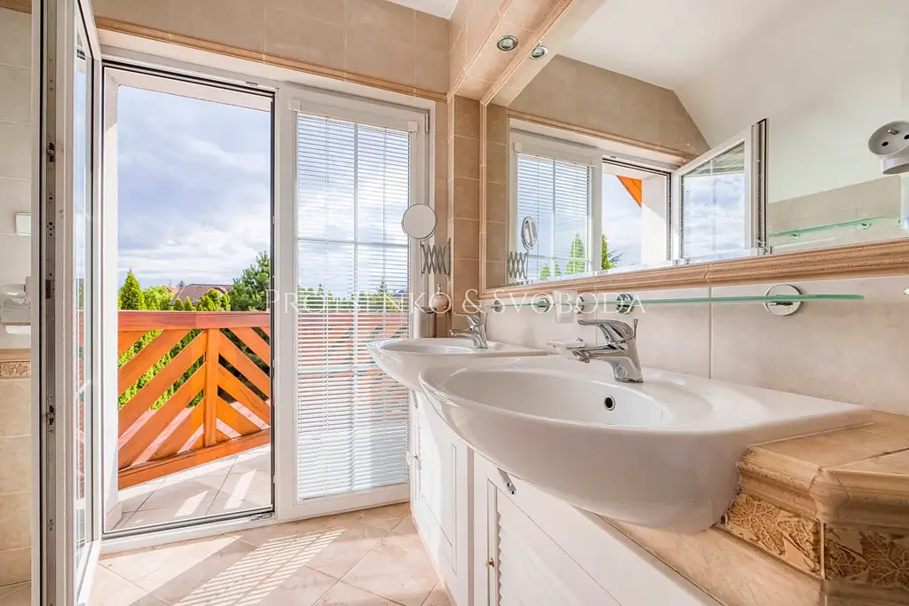 Kromě garáže (19 m²) a dvou balkonů (3,2 m² a 3,2 m²) je součástí domu také terasa s pergolou (5 m²), ze které vede přímý vstup k vyhřívanému bazénu o ploše 21 m².