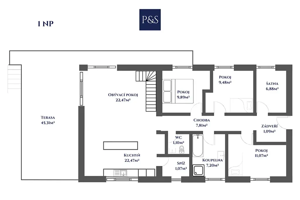 Skutečnou pohádkou je však hlavní obytný prostor. Světlý, velkorysý a vzdušný interiér propojuje obývací pokoj, kuchyni a jídelnu do jednoho přirozeného celku, který se stane srdcem celého domu. Otevřený strop až do krovu dodává prostoru výjimečnou lehkost a noblesu, zatímco loft nad obytnou částí vytváří kouzelné místo navíc — může být pracovnou, knihovnou, klidnou oázou pro odpočinek, dětskou hernou nebo stylovým prostorem pro hosty.