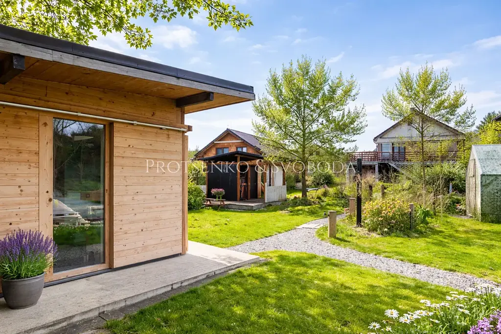 Najdete zde zahradní domek, ohniště, vyvýšené záhony, zahradní sprchu, živé ploty i množství ovocných a okrasných dřevin, které potěší oko i chuť. Štěrkové chodníčky propojují jednotlivá zákoutí a dávají celé zahradě jedinečný řád, eleganci a téměř romantickou atmosféru. Je to místo, kde si děti mohou hrát, dospělí odpočívat, tvořit, pěstovat, snít — a kde každý den přináší nový důvod zůstat o chvíli déle venku.