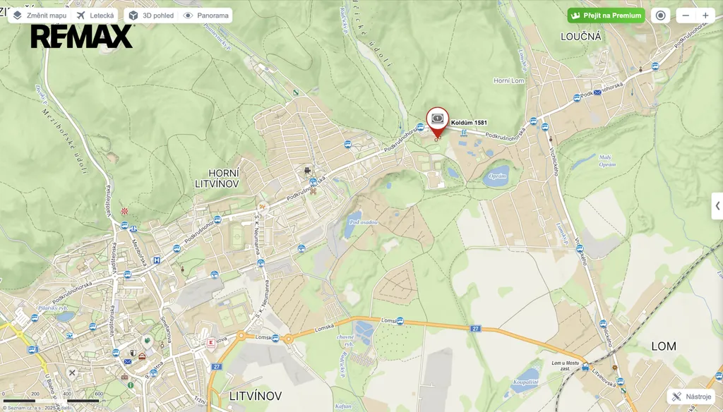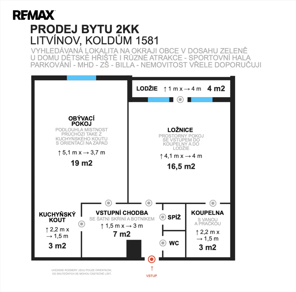 Byt se nachází v 7. patře na Koldůmu č. p. 1581, domu se správou SBD Krušnohor a díky vysokému podlaží nabízí příjemné světlo i hezký výhled. Součástí bytu je západně orientovaná lodžie.