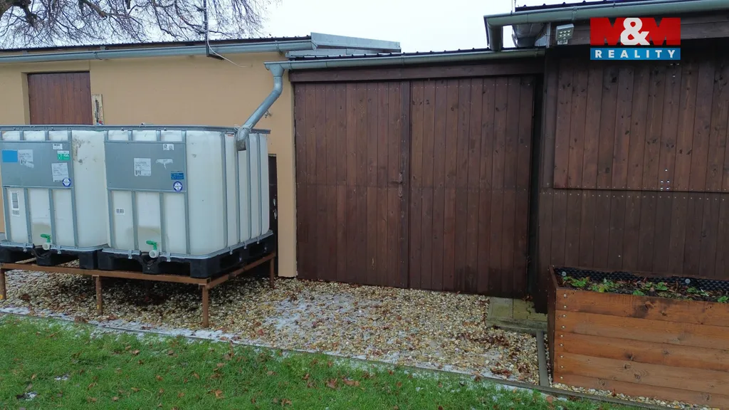 Pergolu s kuchyňským koutkem a s posezením 20 m². Garáž 8,16 m² a zahradní domek 20,06 m² s možností předělat na ložnici. Vrt na vodu hluboký 24 m. Zpevněnou příjezdovou cestu.