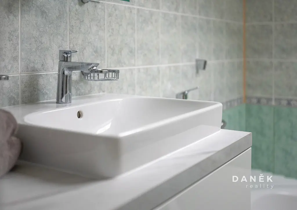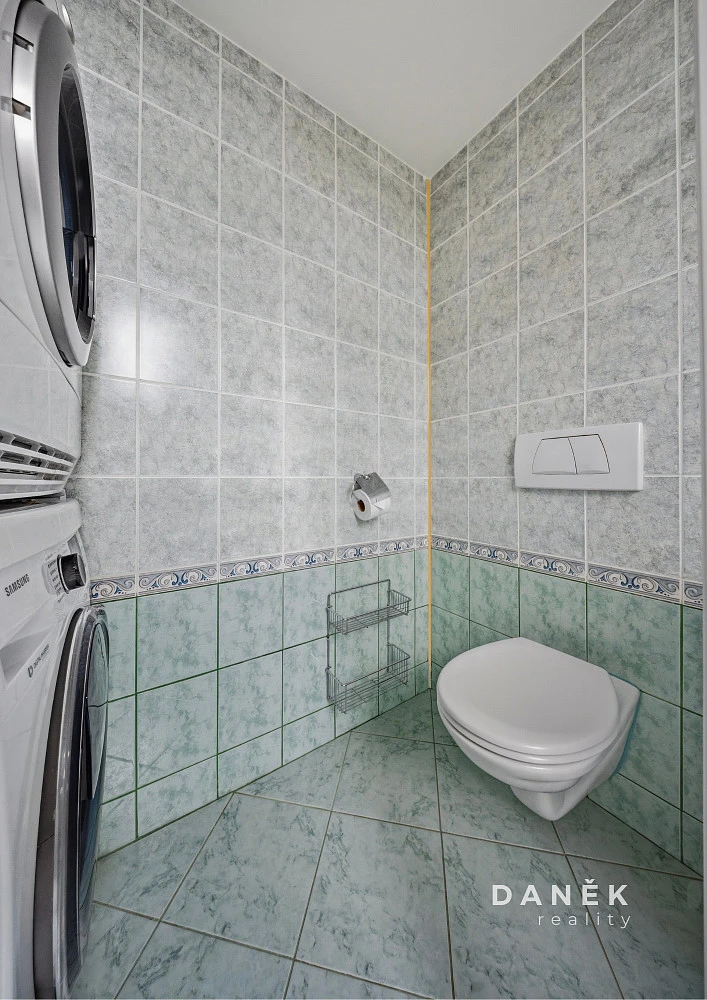 V koupelně najdete zapuštěnou rohovou vanu, závěsné WC Geberit a dostatek prostoru pro pračku a sušičku. Ty mohou v bytě zůstat po dohodě, stejně jako část dalšího vybavení.