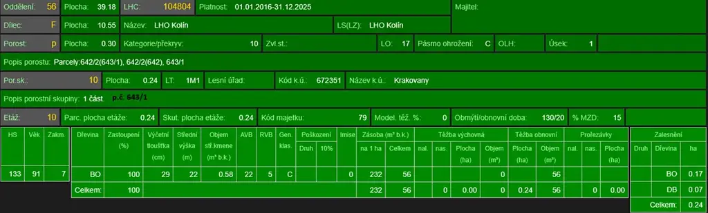 - p.č. 643/1 vedená jako lesní pozemek o celkové výměře 3 138 m2 (stáří lesa 101 let - zastoupení dřevin borovice).