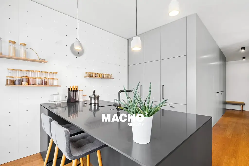 Dominantou bytu je velkorysý obytný prostor s kuchyňským koutem, který nabízí světlo, vzdušnost a dokonalé propojení s venkovním prostorem. Kuchyňská linka vyrobená na míru je plně vybavena vestavěnými spotřebiči a harmonicky zapadá do celkového interiéru.