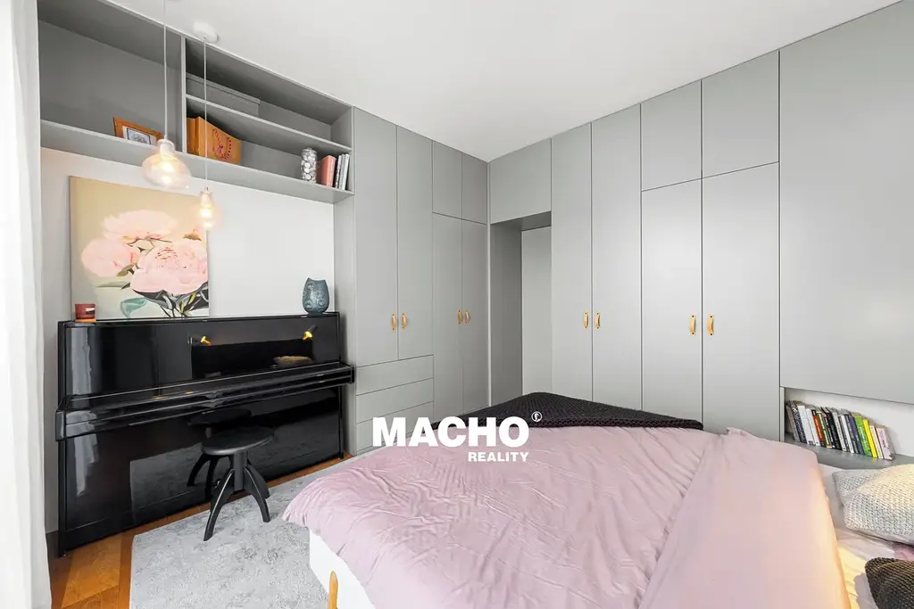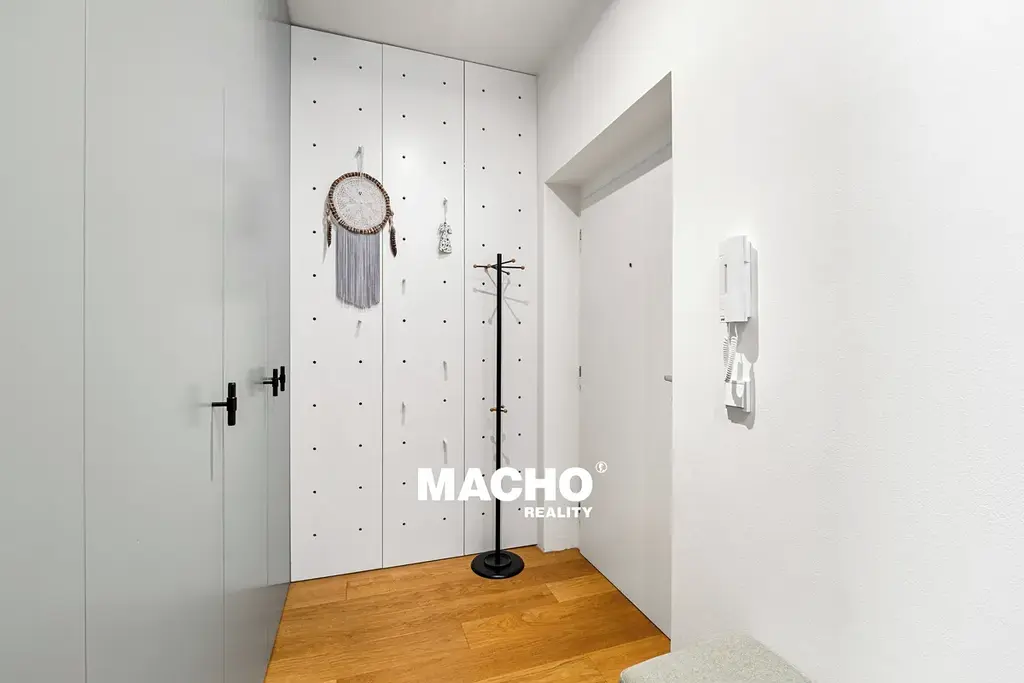 Po vstupu do bytu vás okamžitě zaujmou elegantní vestavěné skříně, které citlivě ukrývají technické zázemí bytu – pračku, elektrokotel i bojler – a zároveň nabízí velkorysé množství úložného prostoru.