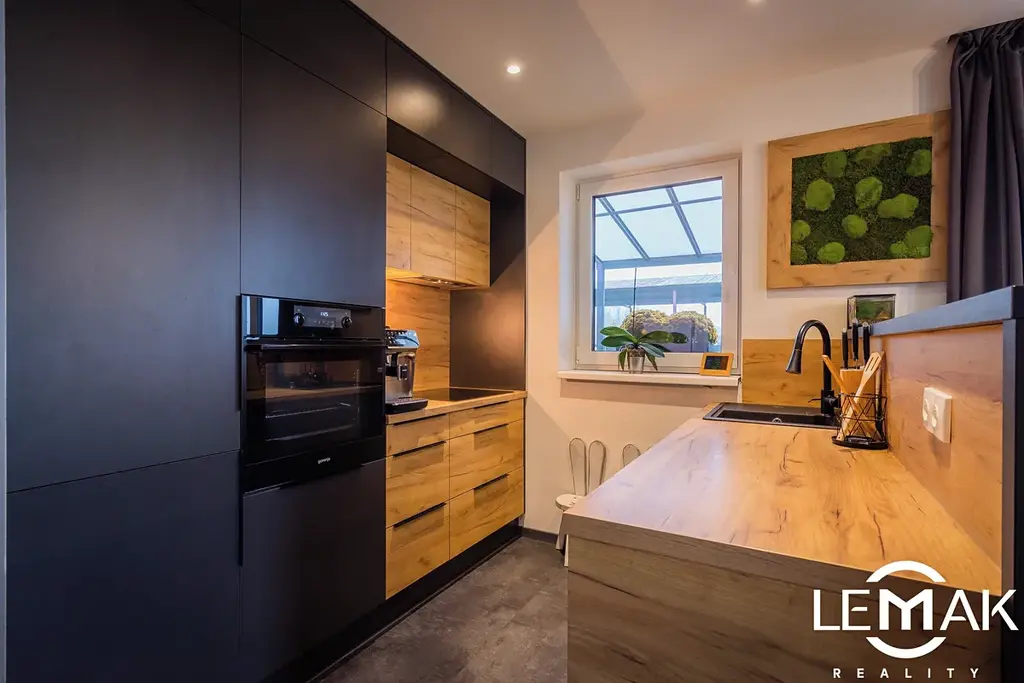 V přízemí nalezneme chodbu s vestavěnou skříní a botníkem, obývací pokoj s kuchyňským koutem od truhláře na míru včetně všech spotřebičů, samostatnou toaletu a komoru. V patře poté ložnici, dětský pokoj s vestavěnou skříní a koupelnu s vanou, toaletou ( včetně pračky a sušičky ). Stahovacími schody se dostaneme také do půdního prostoru.