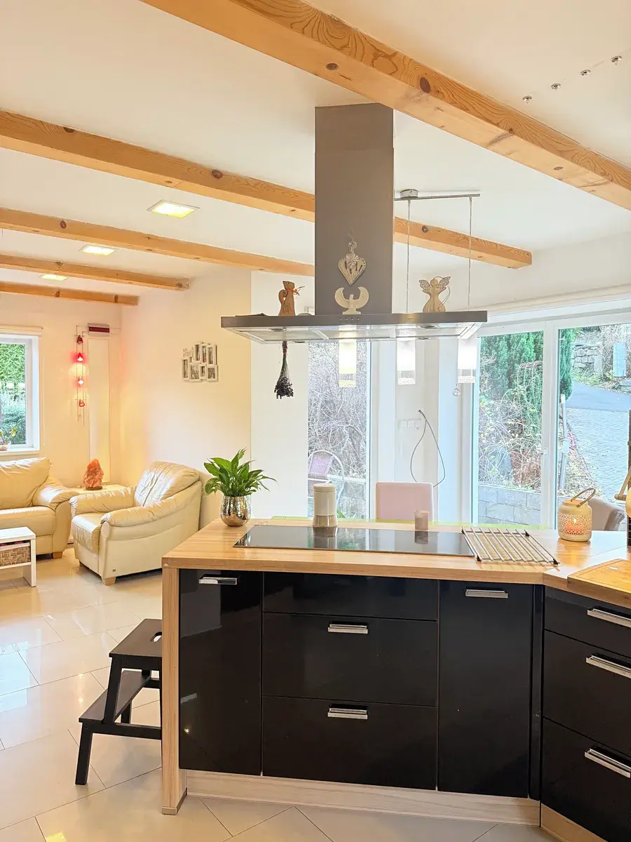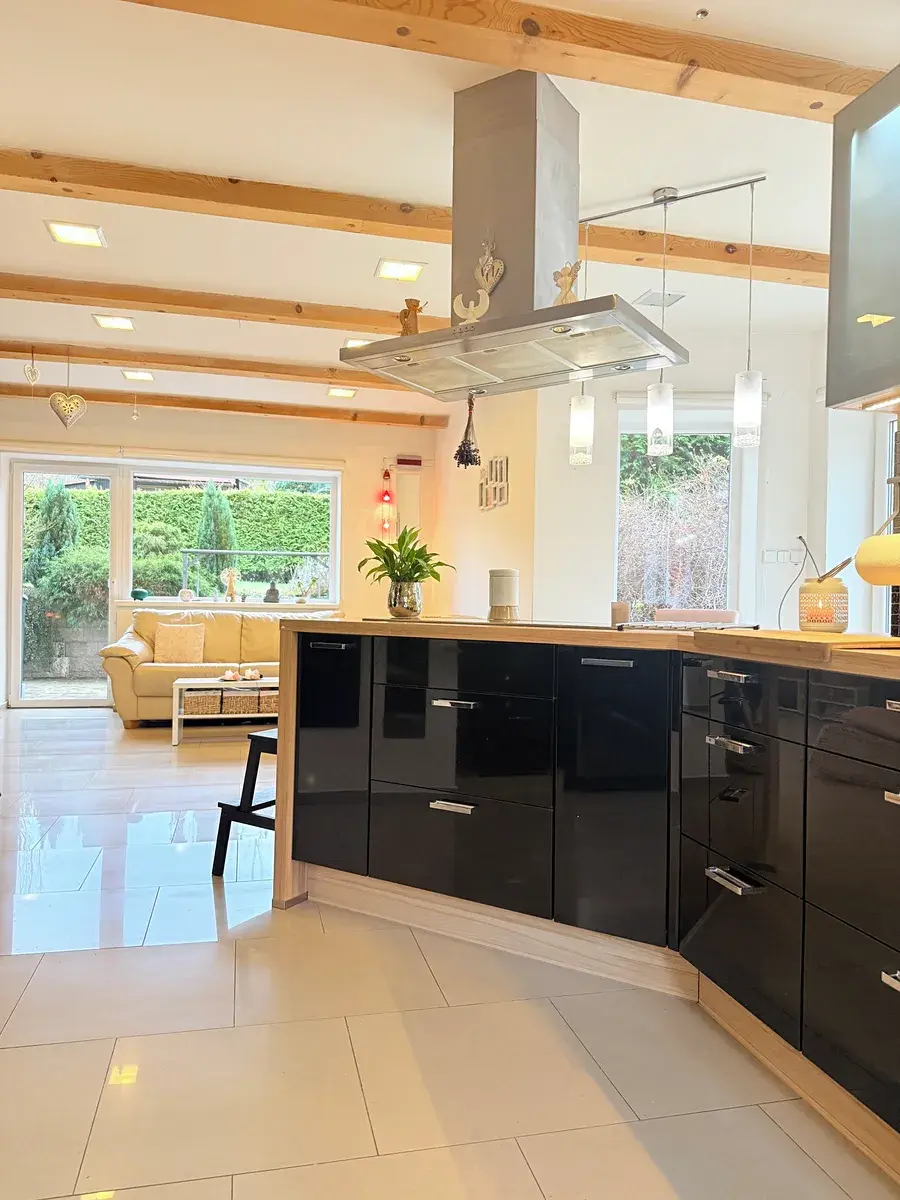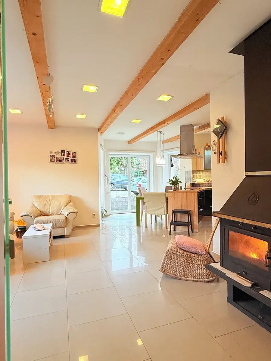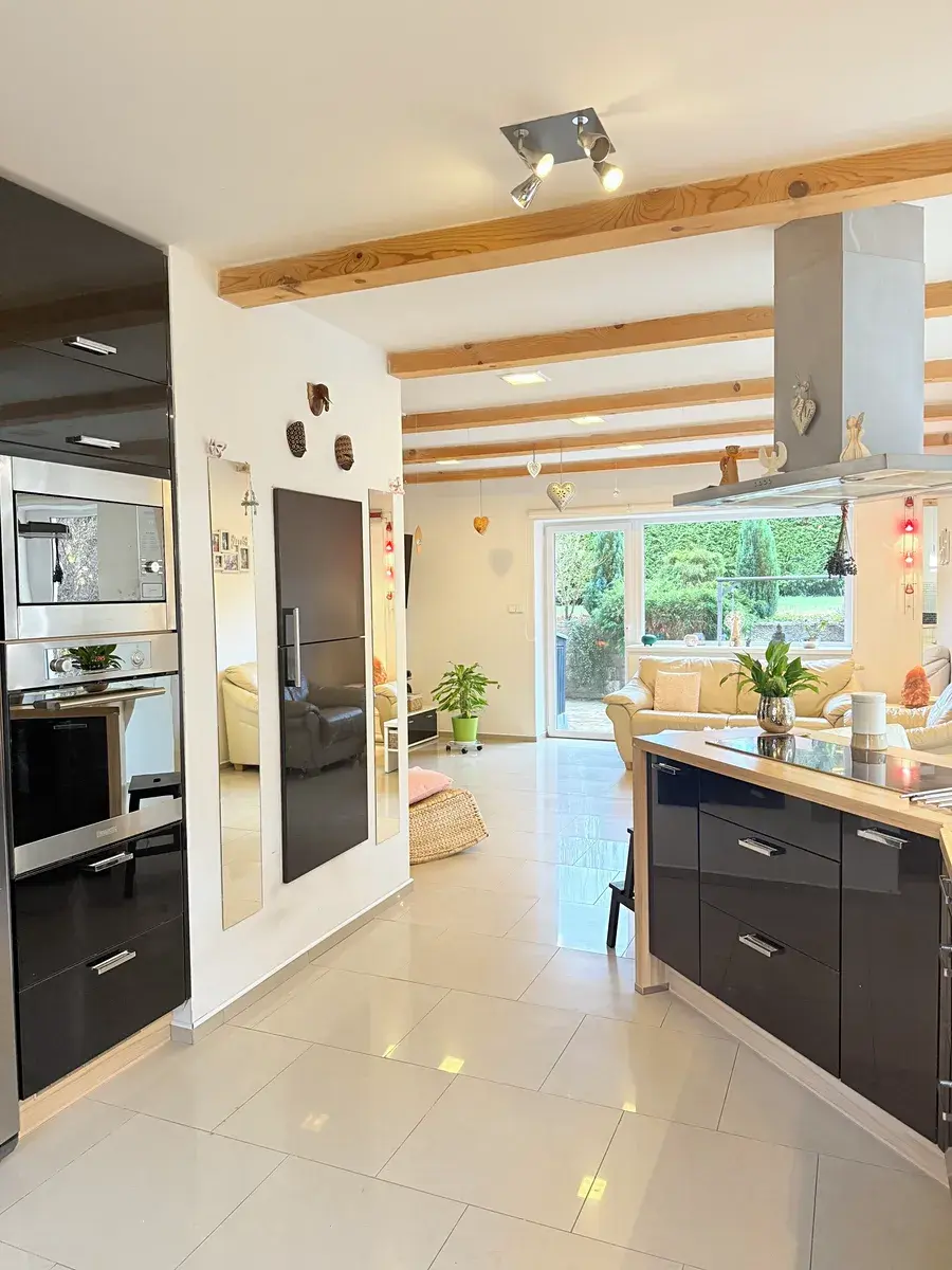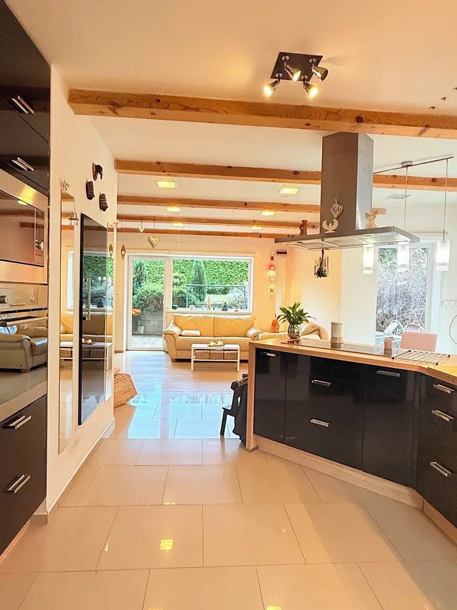 • atypická kuchyň spojená s velkým obývacím pokojem, který má balkónové dveře na terasu se zahradou