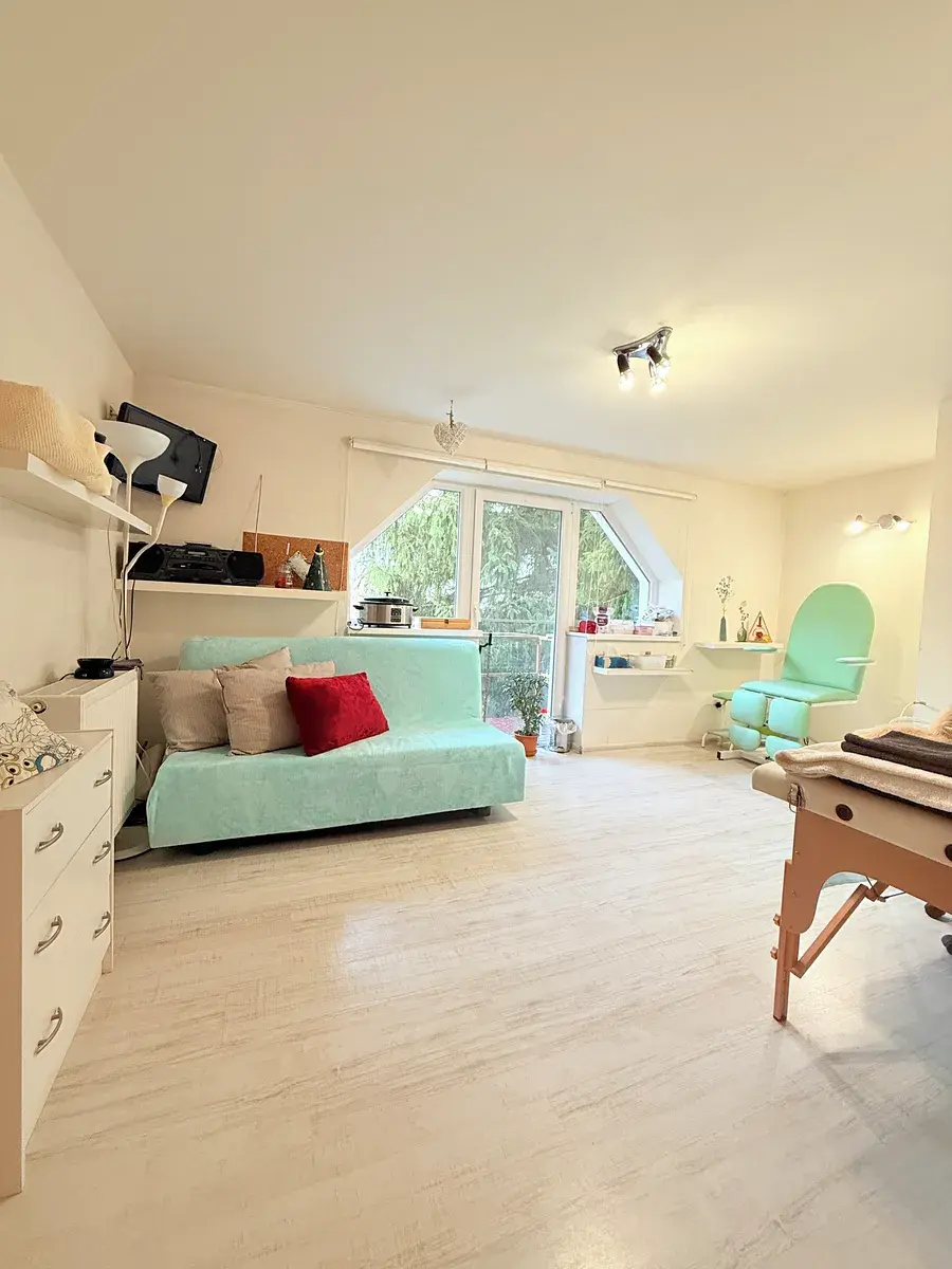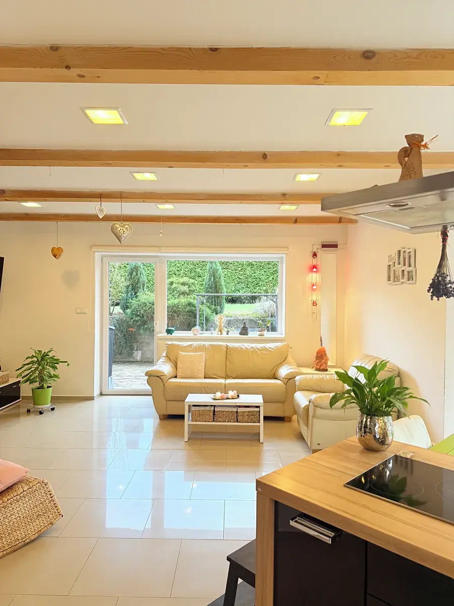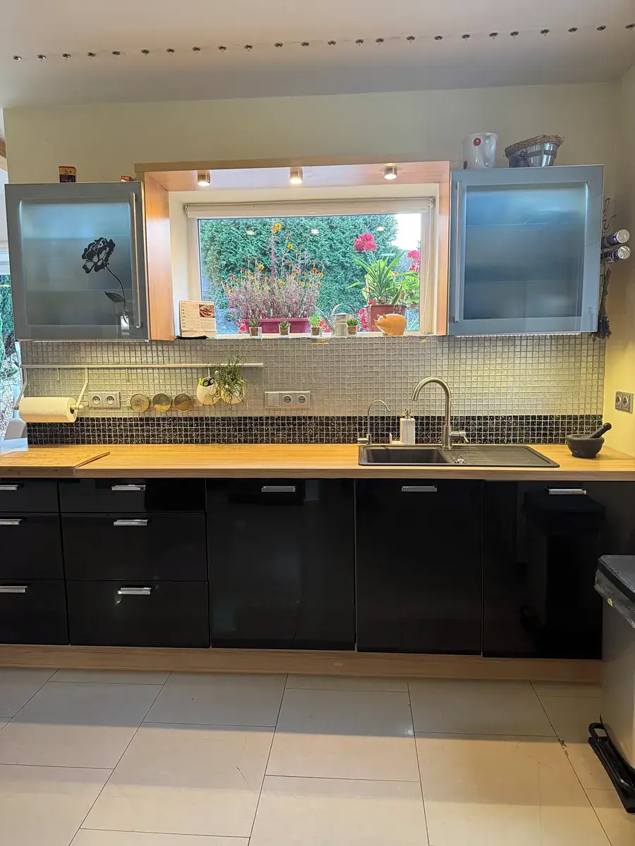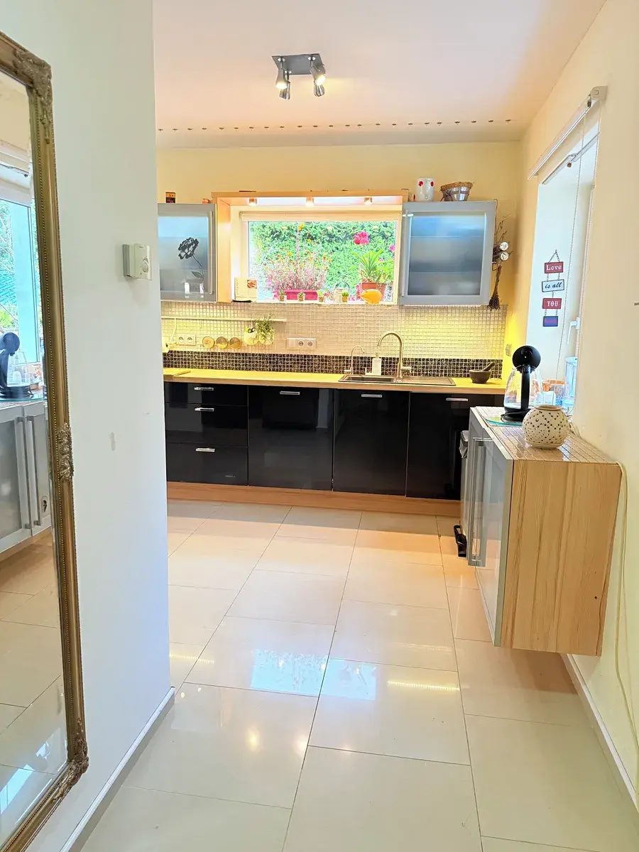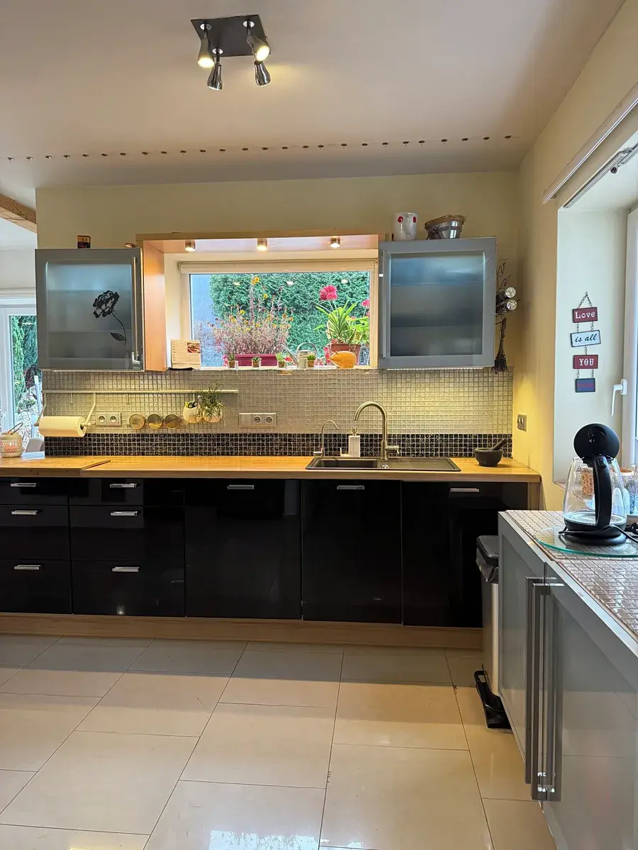 • atypická kuchyň spojená s velkým obývacím pokojem, který má balkónové dveře na terasu se zahradou