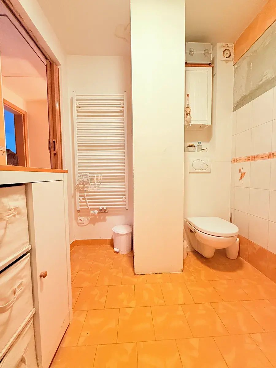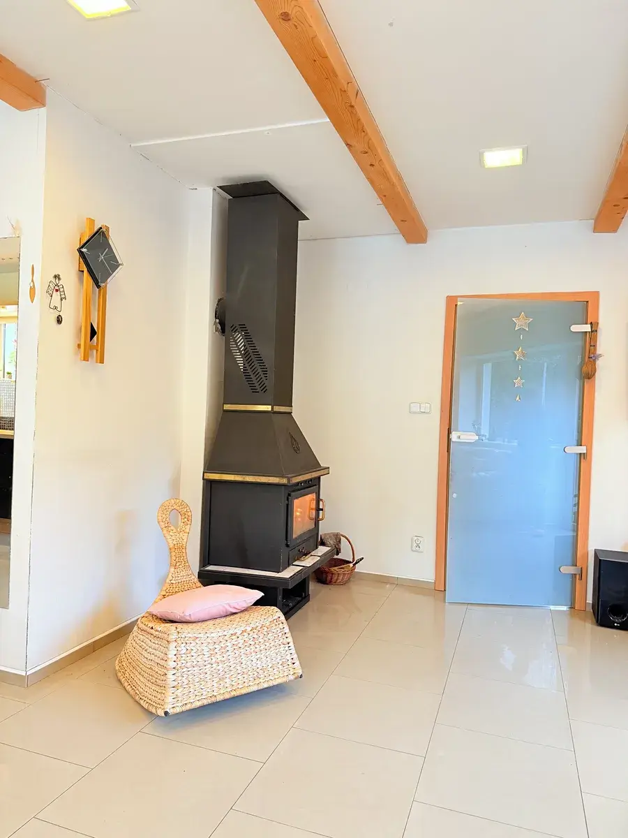 Vytápění tepelným čerpadlem (voda-vzduch), které bude časem vyžadovat výměnu. V přízemí domu je podlahové vytápění a krbová kamna.