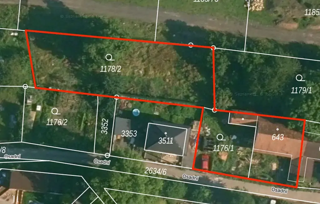 Pozemek se skládá ze dvou částí – 462 m² se stavbou a 748 m² aktuálně sloužících jako zahrada. Obě části jsou propojené průjezdem širokým 3,1 m. Terén je mírně svažitý, což může být zajímavé pro zahradní úpravy nebo architektonické řešení domu.
