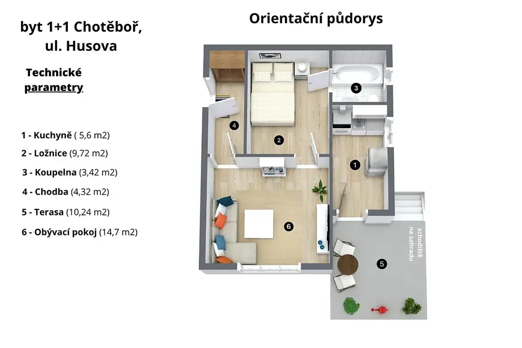 Byt o celkové ploše 53 m2 se nachází v 1.podlaží zděného domu a dispozičně je řešen vstupní chodbou, prostorným obývacím pokojem, ložnicí, koupelnou s vanou, toaletou a umyvadlem, kuchyní s kuchyňskou linkou vybavenou sklokeramickou deskou, lednicí, horkovzdušnou troubou a mikrovlnnou troubou, z kuchyně se balkónovými dveřmi dostaneme na terasu se schodištěm na zahradu.