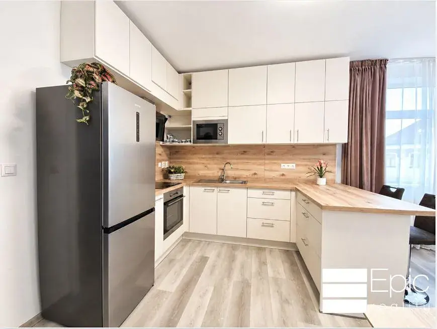 Byt působí čistě, útulně a prakticky. Hlavní obytný prostor tvoří prostorný obývací pokoj propojený s kuchyňským koutem a jídelní částí. Kuchyňská linka je moderní, laděná do kombinace světlých tónů a dekoru dřeva, a je vybavena vestavěnými spotřebiči včetně trouby, varné desky, digestoře, mikrovlnné trouby a lednice s mrazákem.