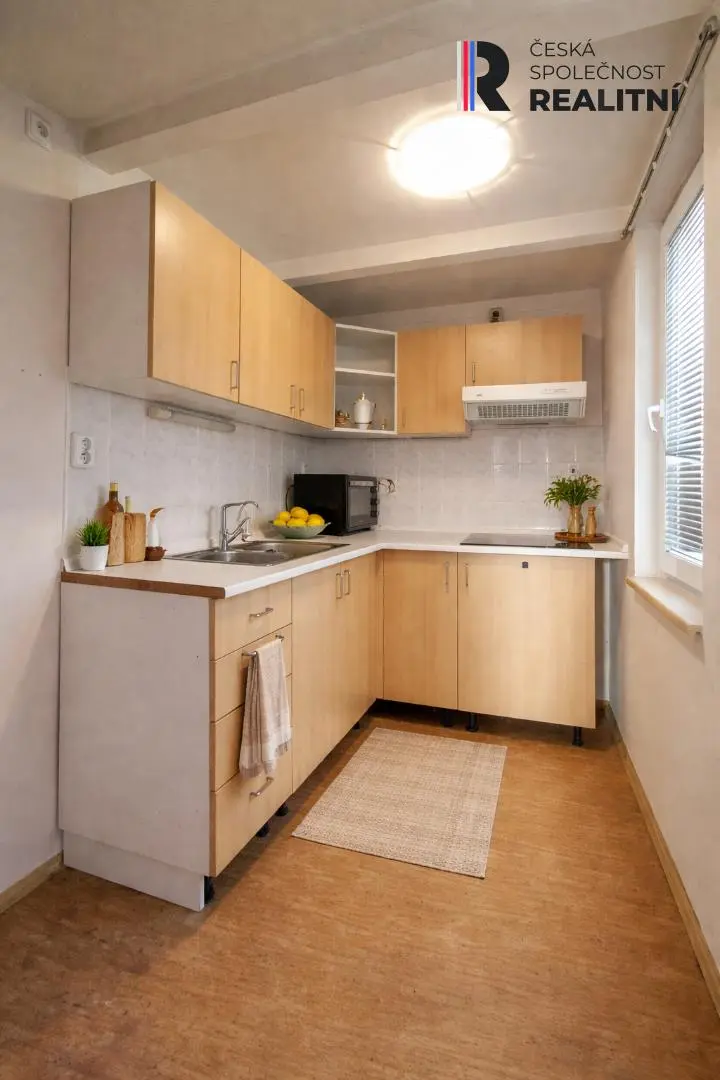 Byt s jihozápadní orientací nabízí otevřený obývací prostor s kuchyňským koutem (kuchyňská linka, varná deska, digestoř), samostatnou ložnici a v patře další otevřený prostor a menší pokoj vhodný jako dětský pokoj nebo pracovna. Byt je prázdný a pro dokreslení je udělaná vizualizace.
