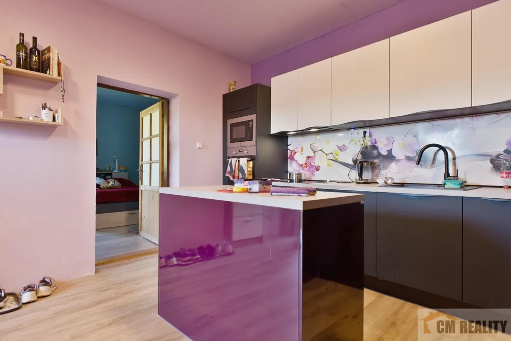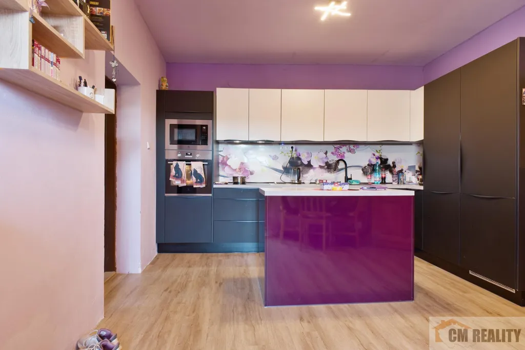 V interiéru je nová kuchyňská linka Oresi se spotřebiči, vestavnou troubou, sklokeramickou varnou deskou, lednicí, mrazákem a myčkou. Součástí pronájmu je také vybavení a vestavné skříně, které jsou vidět na fotografiích.