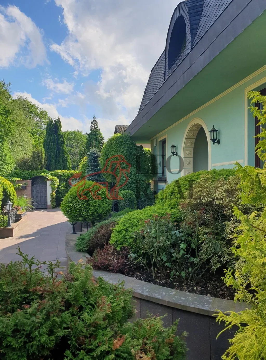 Zahrada je navržena ve stylu francouzské zahradní architektury s množstvím vzrostlých stromů a okrasných dřevin. Atmosféru dotvářejí pískovcové chodníčky, originální skulptury a stylové lampy pro noční osvětlení. Pískovcová kašna a altán dotvářejí ráz této zahrady, plné romantických zákoutí a ptačího zpěvu. O zavlažování se stará automatický závlahový systém napojený na vlastní 17 metrů hlubokou studnu s dostatkem vody, na kterou lze v případě potřeby alternativně připojit i celý dům.