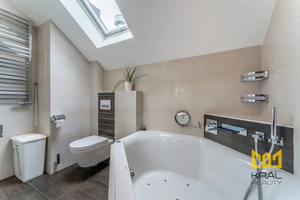 Kvalitní koupelna Villeroy Boch s masážní rohovou vanou, dvou-umyvadlem, keramickým závěsným WC, pračkou. Z koupelny je přístup na půdu.